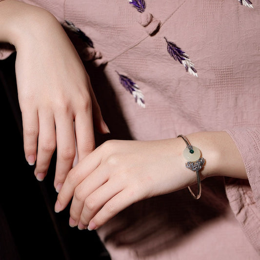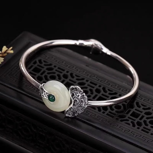 Zen Healing Hetian Jade Peace Buckle Tibetan Silver Bracelet