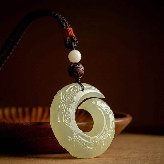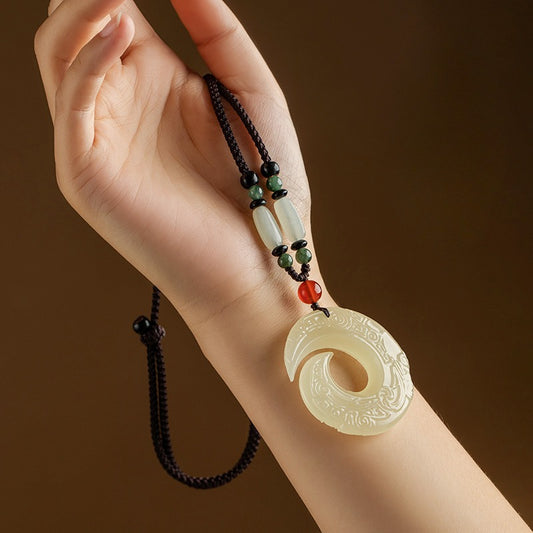 A jade necklace pendant symbolizes wisdom, balance, and protection. Many jade pendants feature intricate carvings like dragons (symbolizing power), phoenixes (representing rebirth), or lotus flowers (signifying purity).