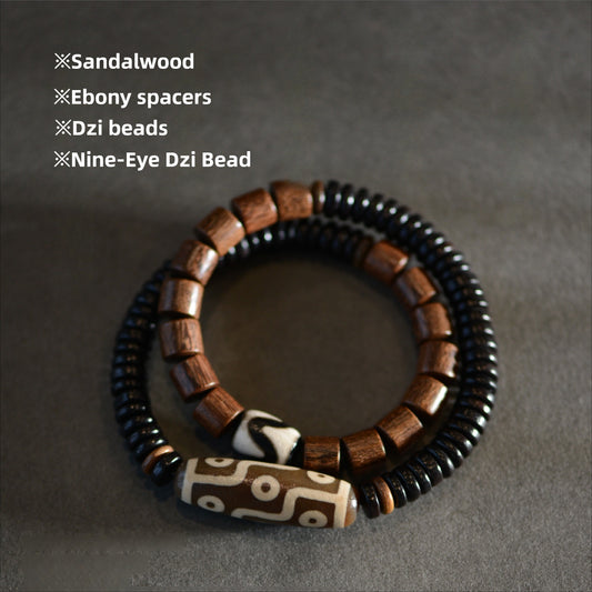 Zen Healing Tibetan Ebony Sandalwood Agate Nine-Eye Dzi Bead Protection Double Wrap Bracelet