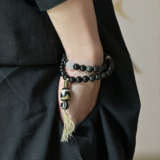 Zen Healing Tibetan Obsidian Blue Moonstone Dzi Clam Double Wrap Bracelet