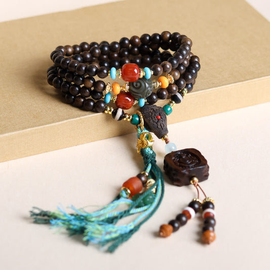 Bracelet bouddhiste en perles de bois d'agar et de jade Hetian - Pouvoir de la paix et du calme
