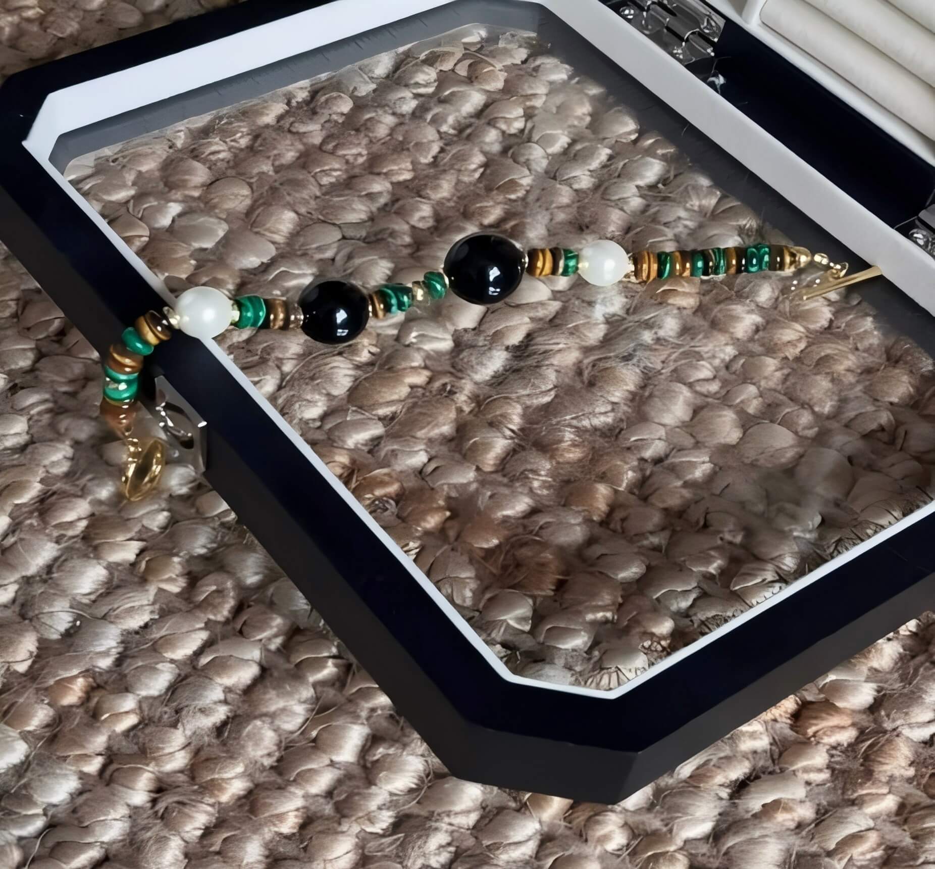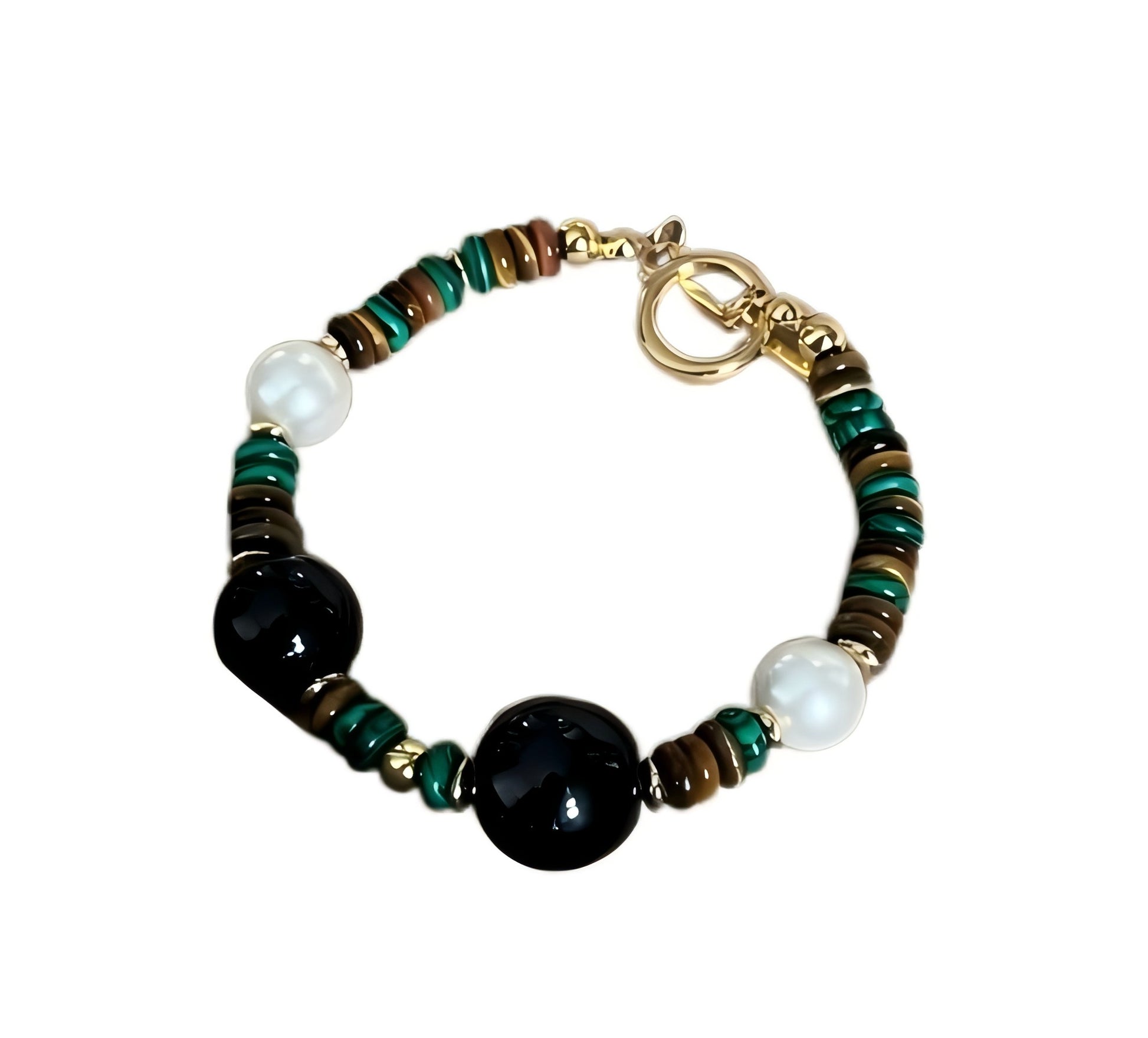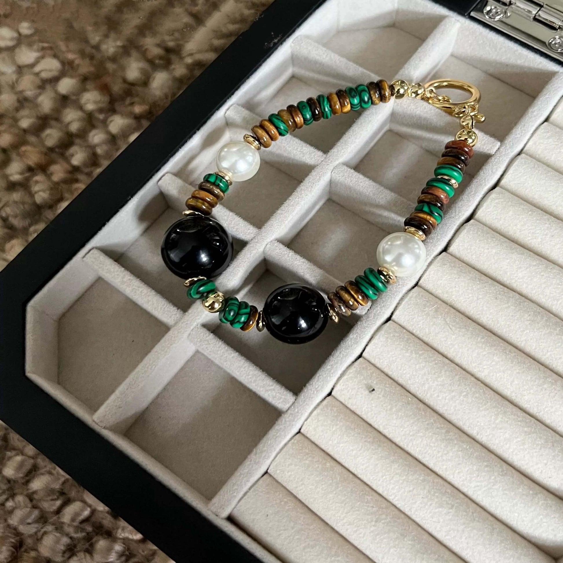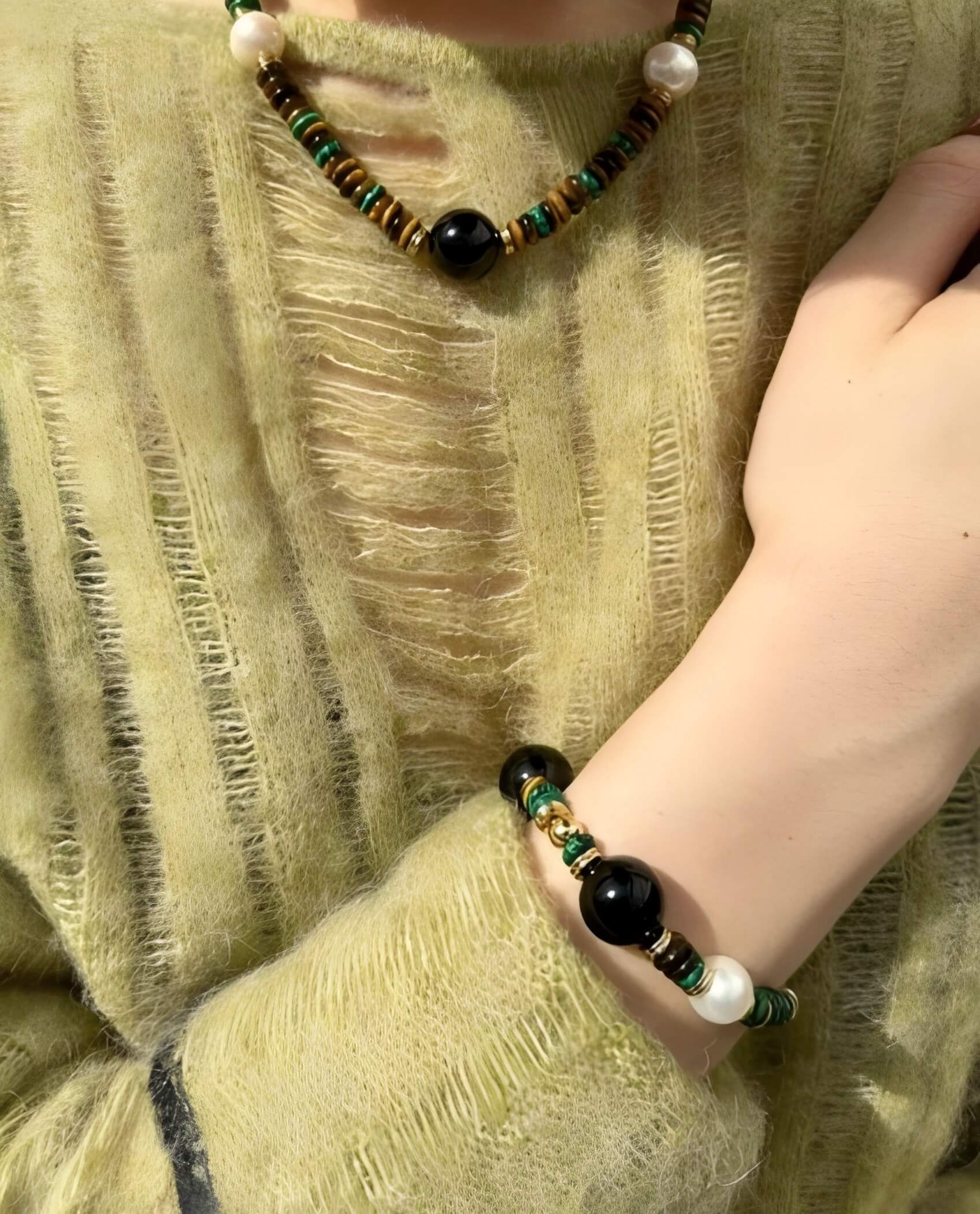 Le vert émeraude de la malachite, la profondeur de l'agate noire et la chaleur des perles, les trois sont entrelacés, comme le pouvoir mystérieux conféré par la nature, apportant tranquillité et guérison à votre âme.