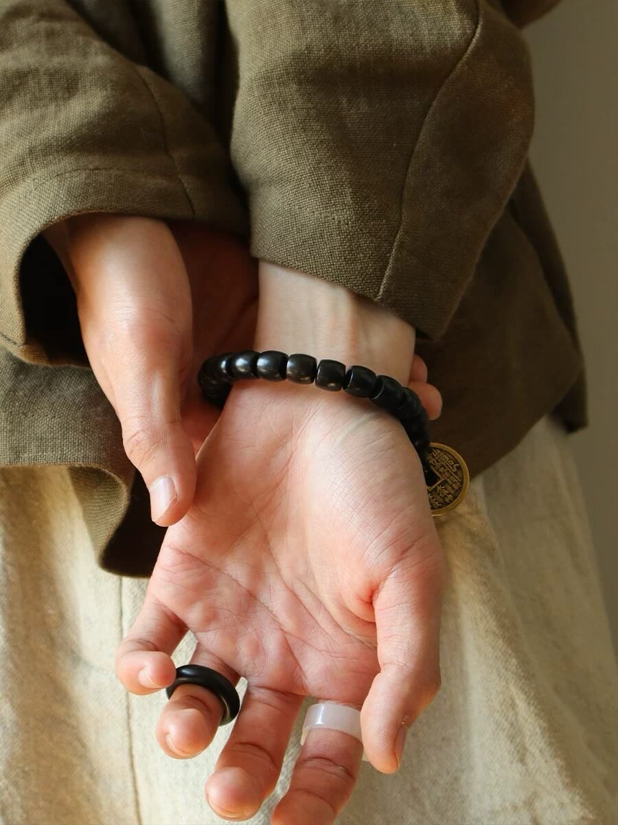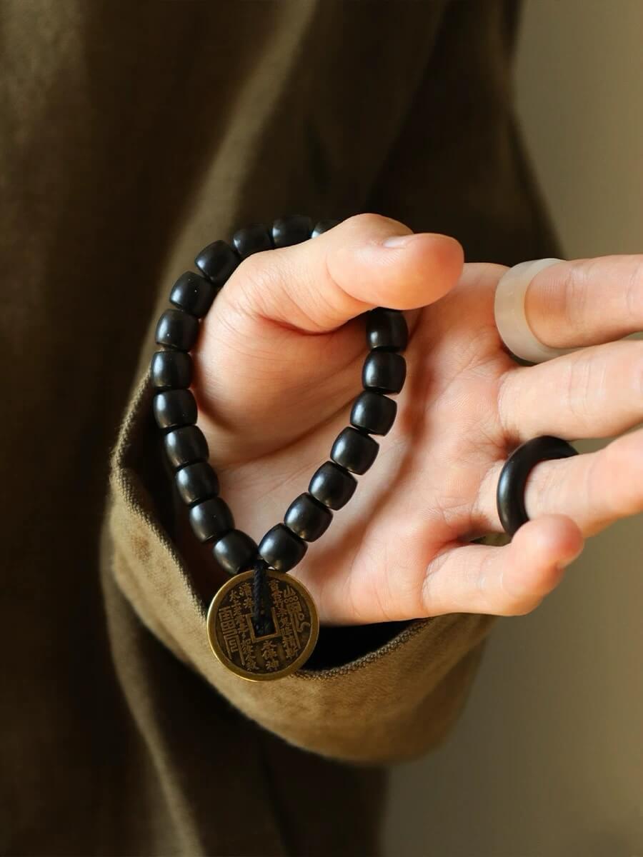 L'ébène est un bois très prisé et dense, connu pour sa couleur noire profonde et son extrême dureté. Dans la culture bouddhiste, le bois de santal est souvent utilisé pour fabriquer des perles et des objets rituels religieux. On pense qu'il éloigne les mauvais esprits et offre une protection.
