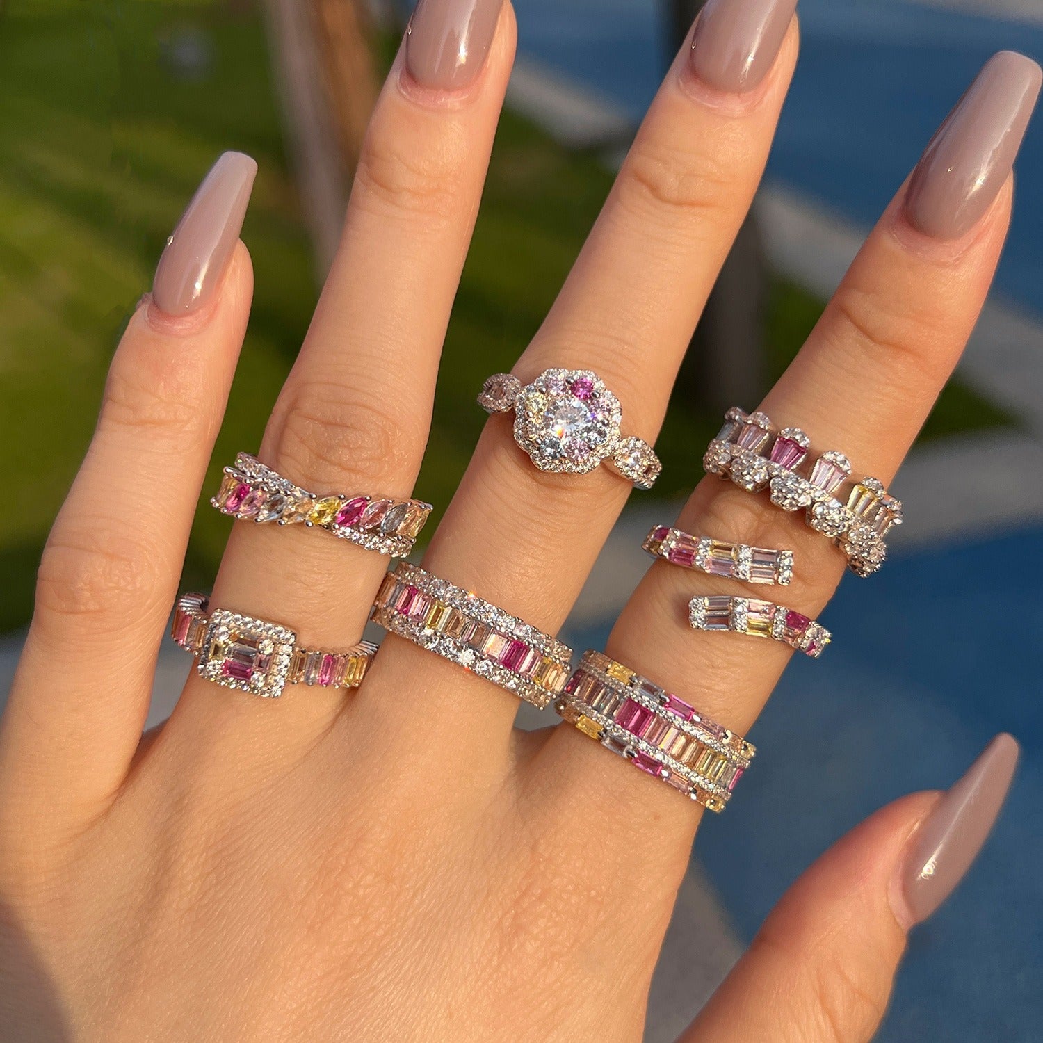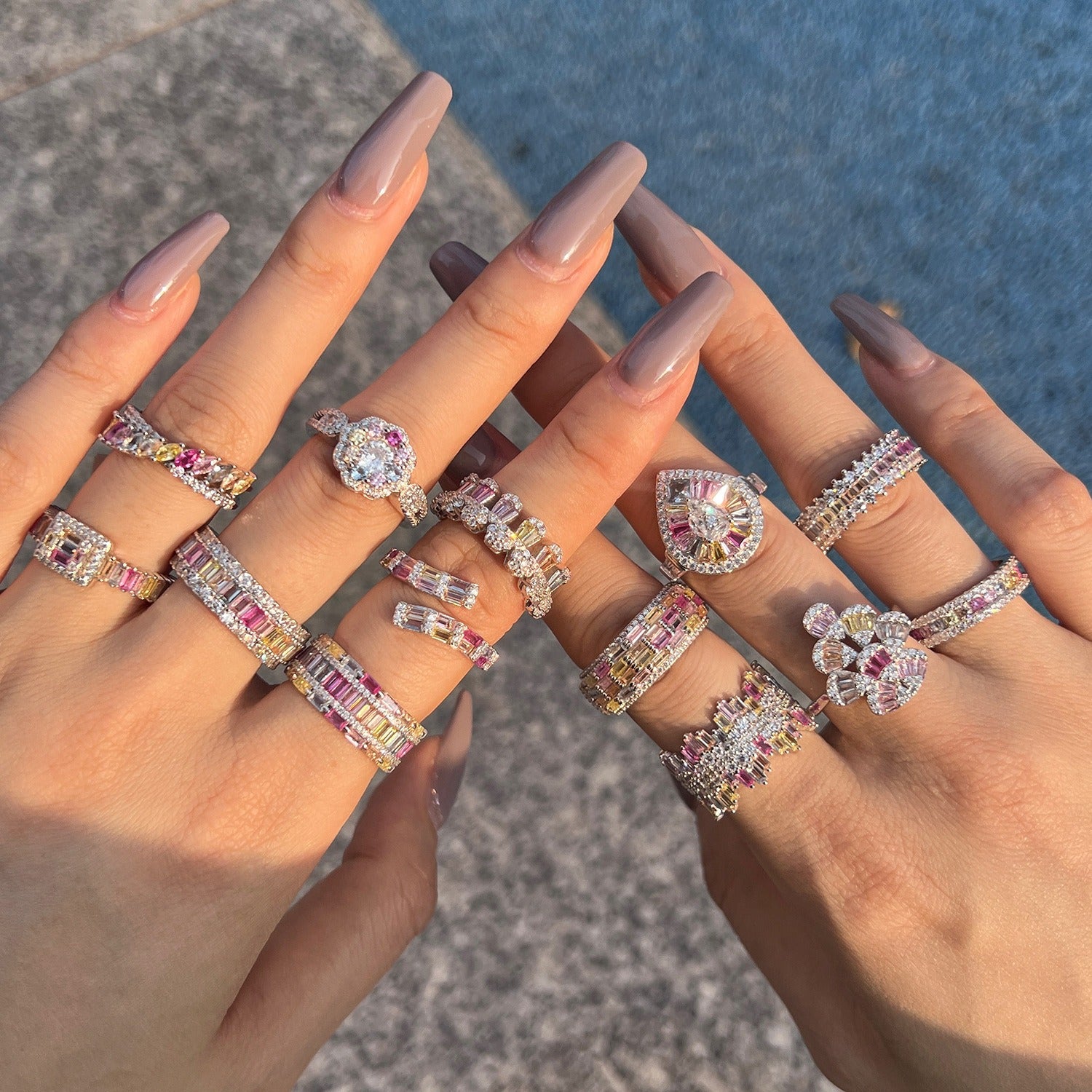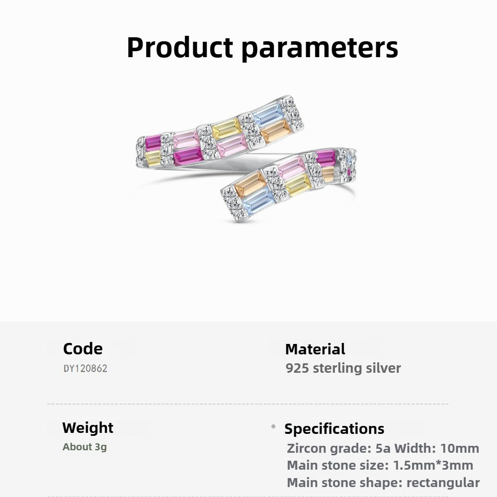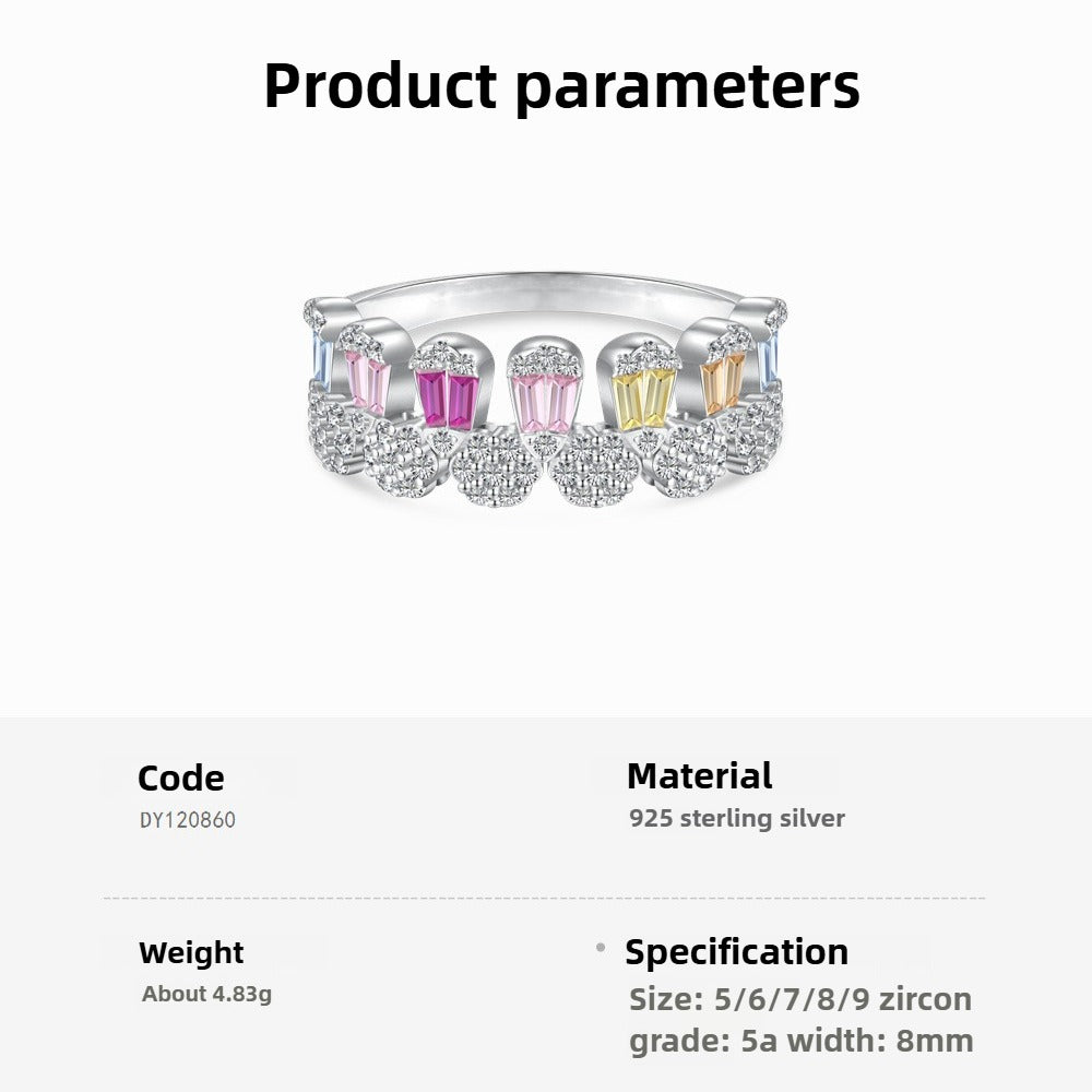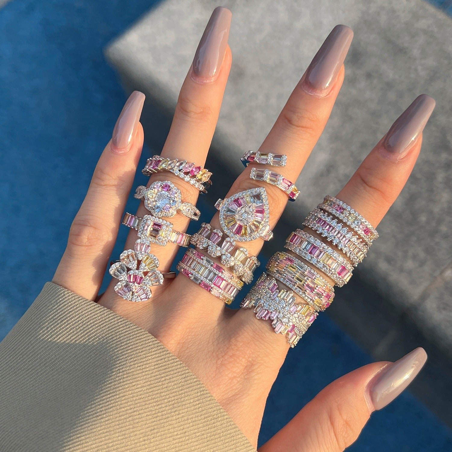 This series of rings features 925 sterling silver bands in a variety of unique designs, each inlaid with high-quality colorful cubic zirconia stones. Inspired by the dopamine dressing trend, the rings are crafted to boost mood and style — whether you're layering for a statement or wearing solo for a minimalist vibe.