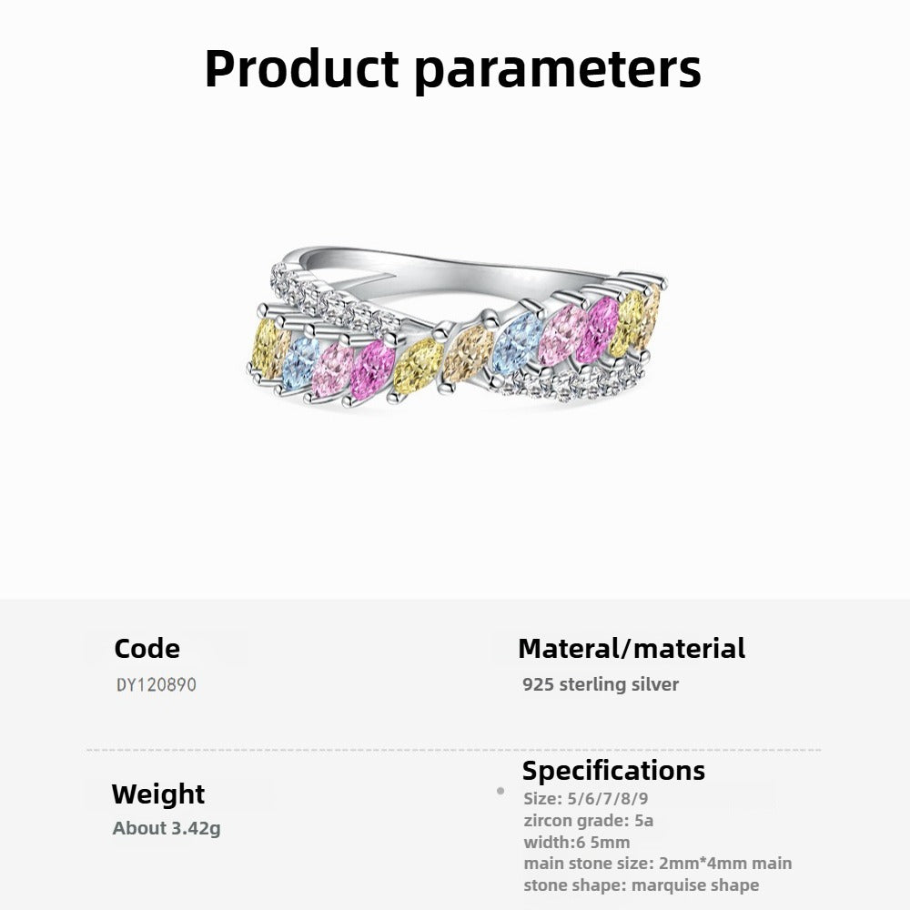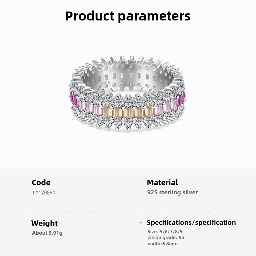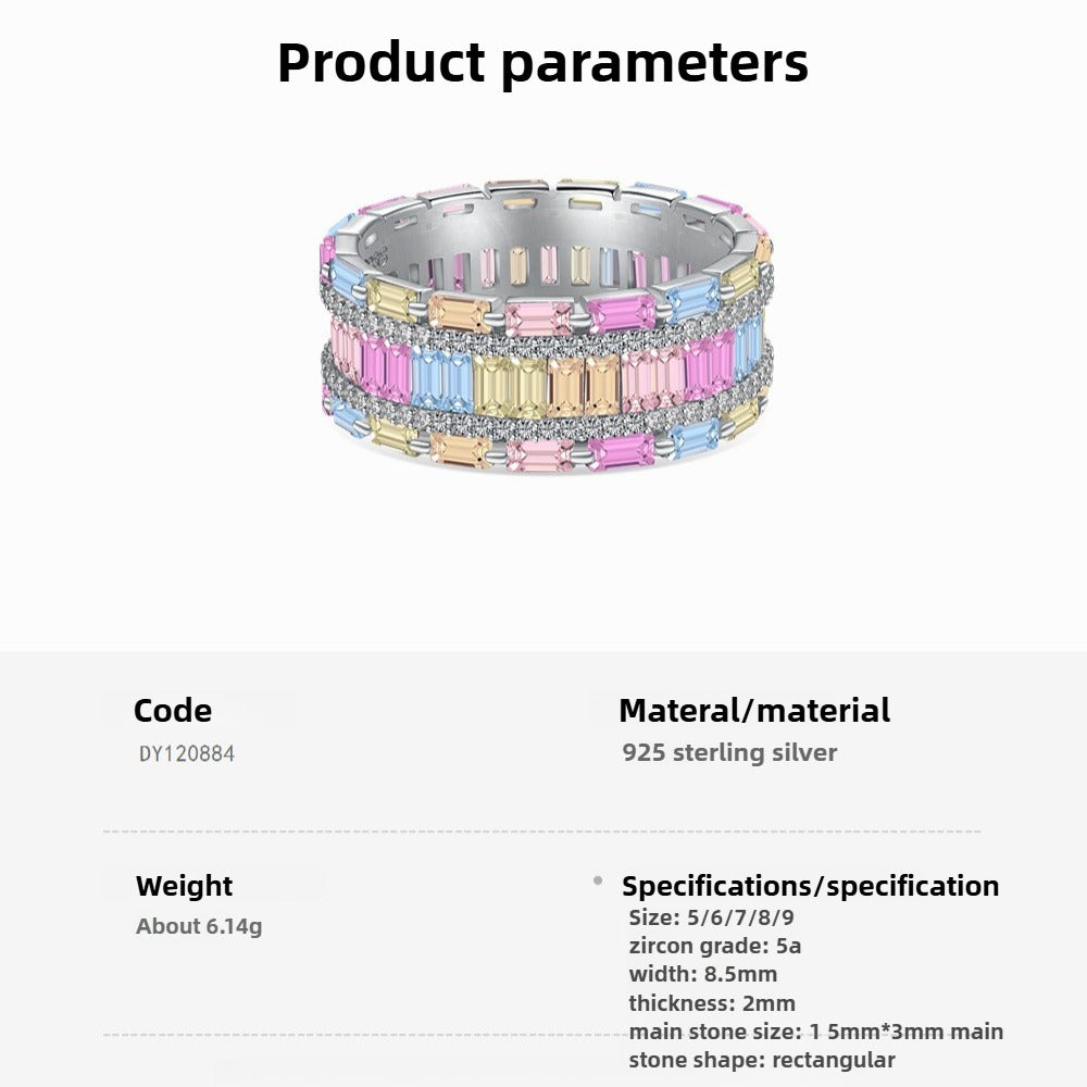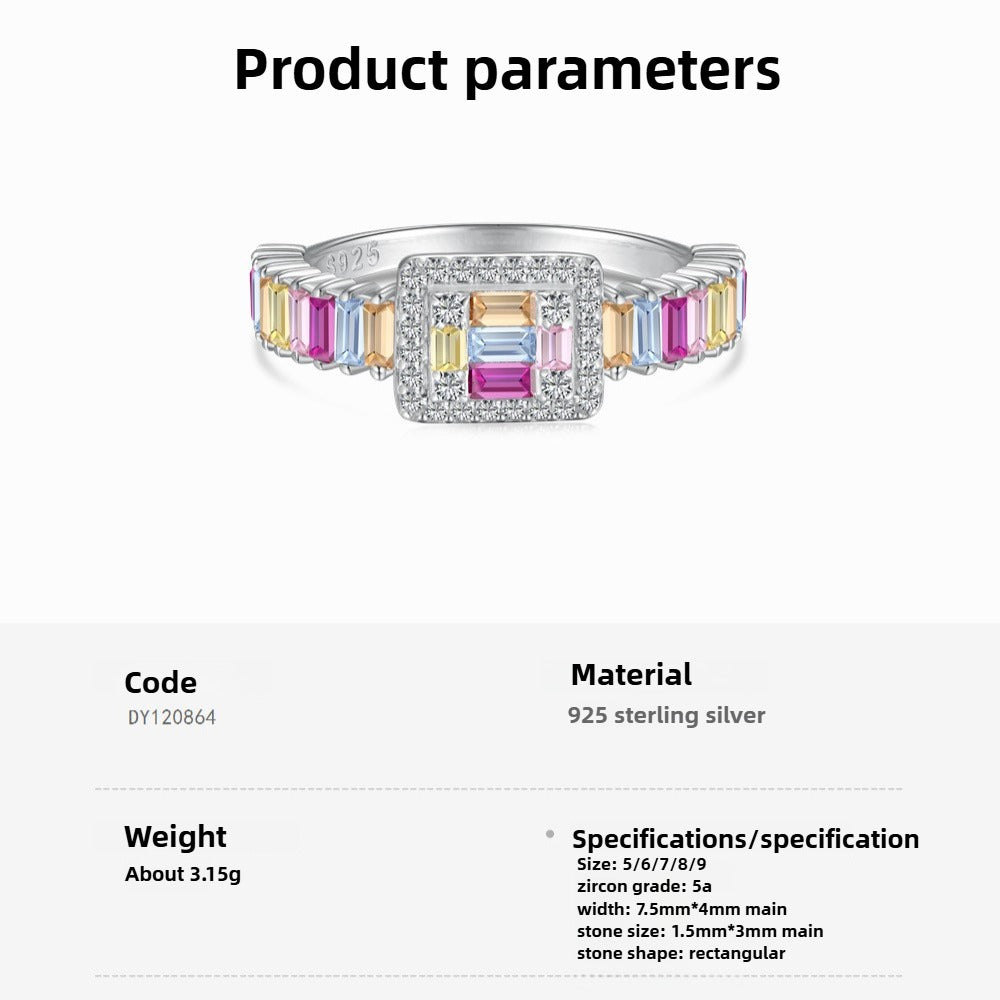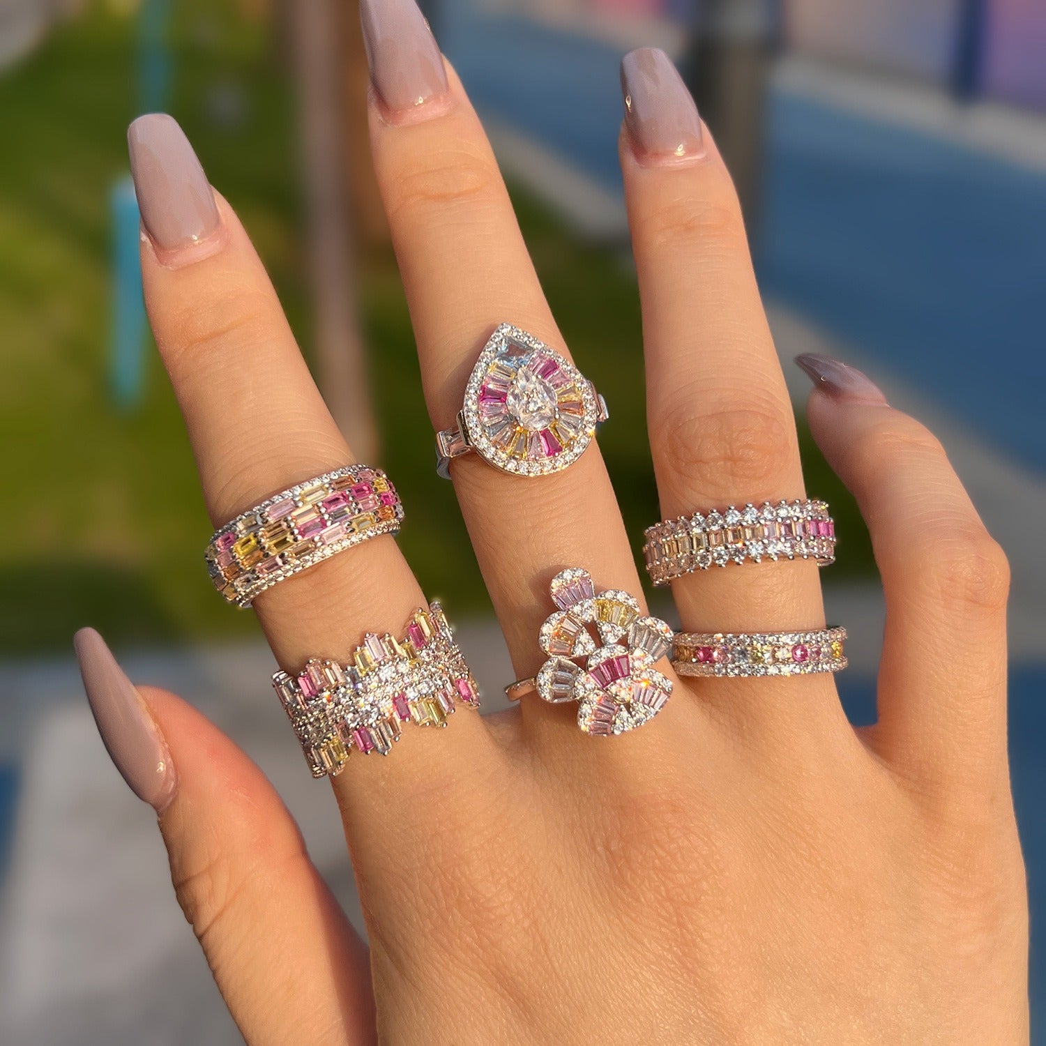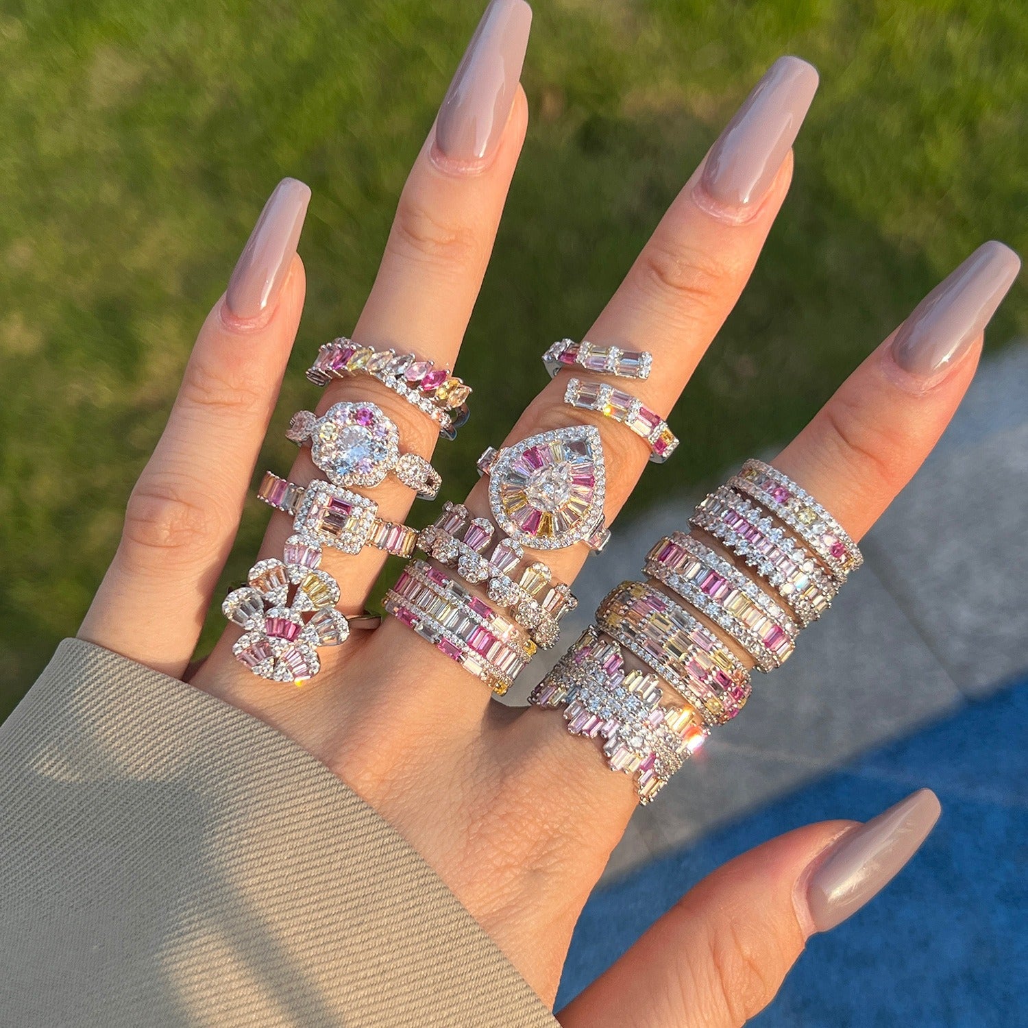 This series of rings features 925 sterling silver bands in a variety of unique designs, each inlaid with high-quality colorful cubic zirconia stones. Inspired by the dopamine dressing trend, the rings are crafted to boost mood and style — whether you're layering for a statement or wearing solo for a minimalist vibe.