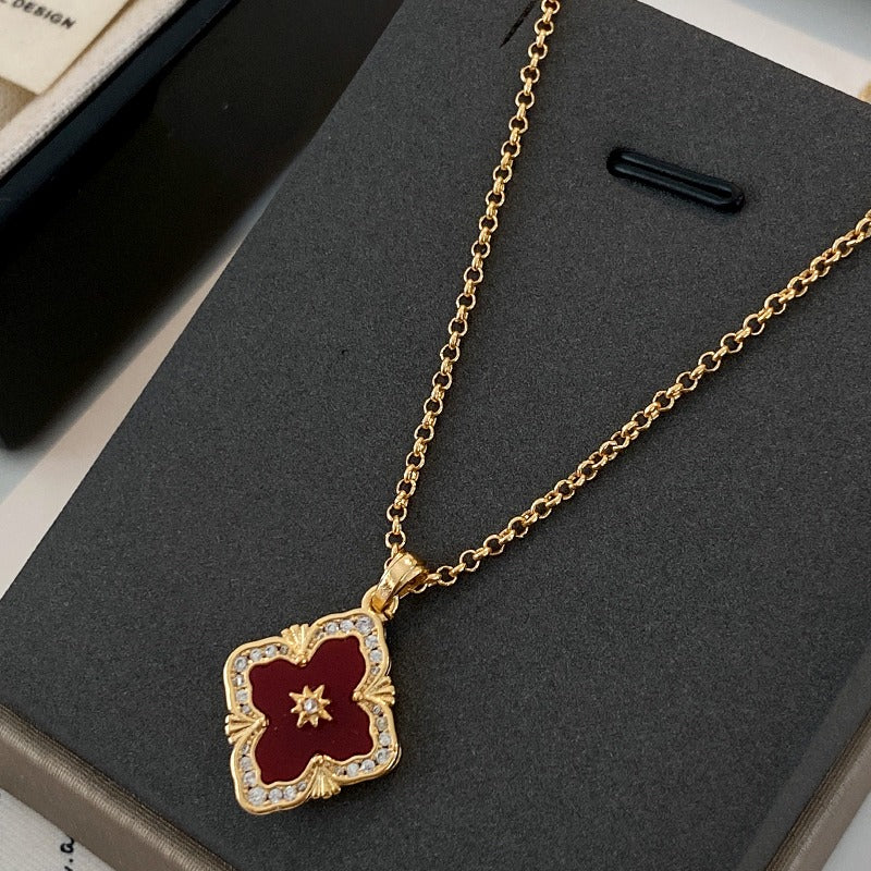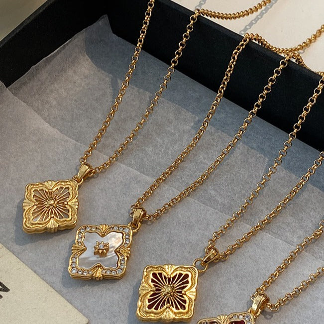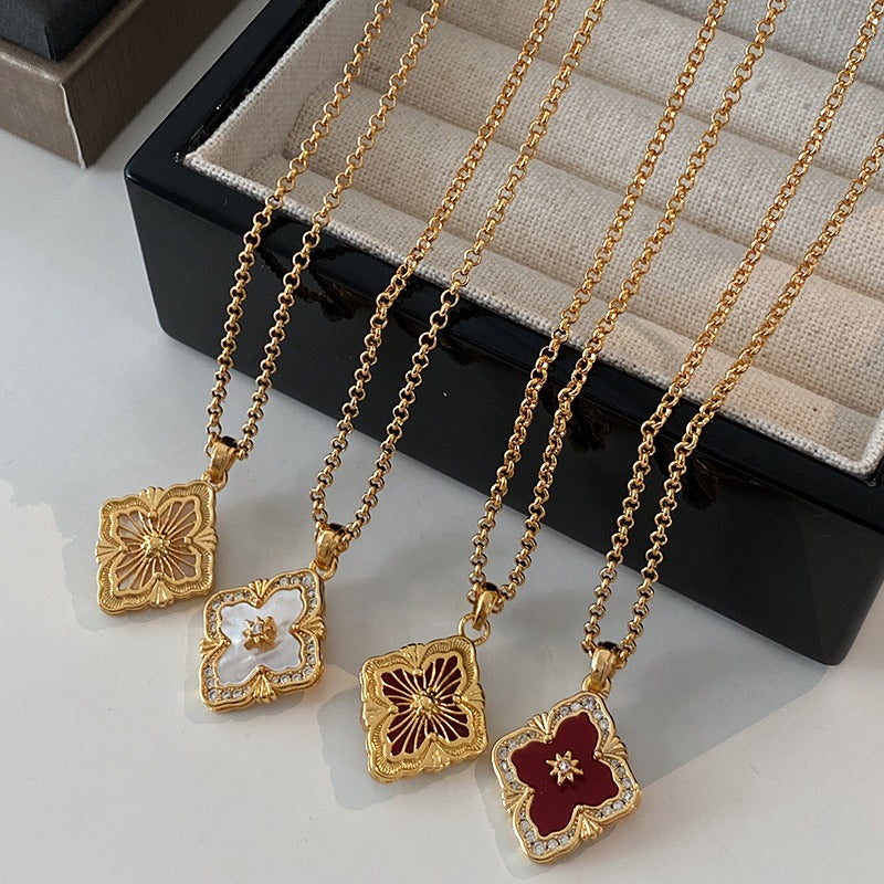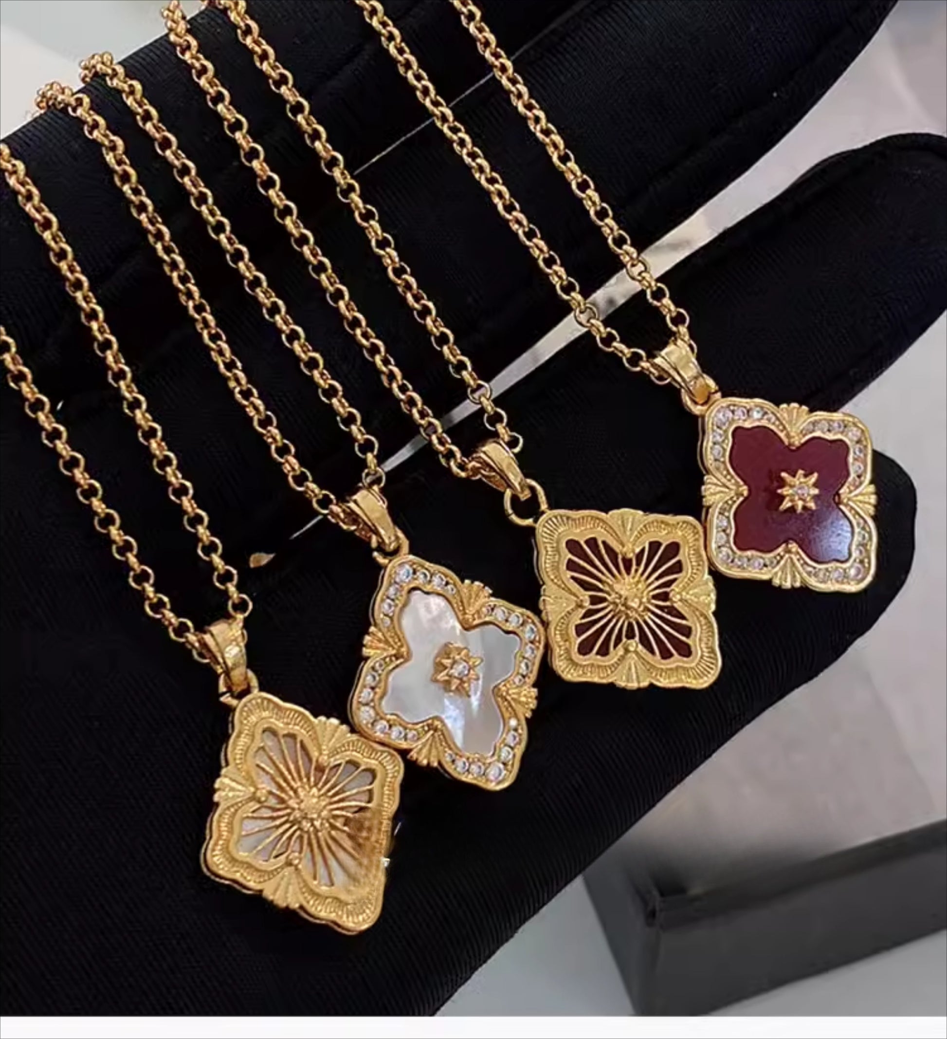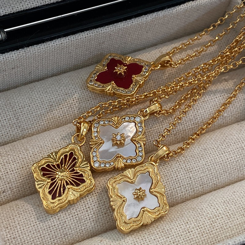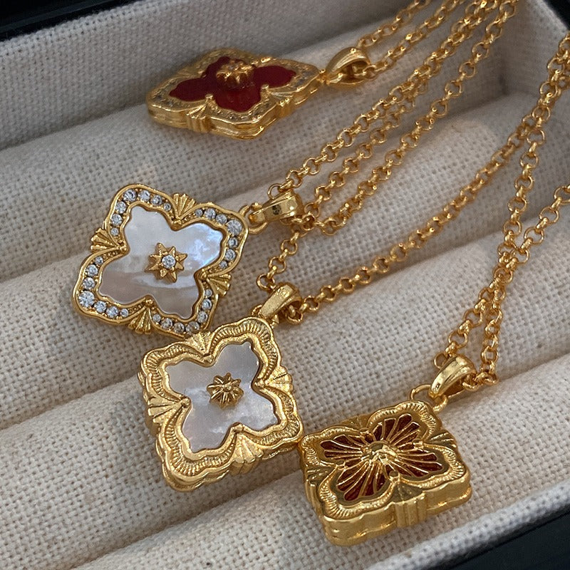 The Baroque 24K Gold Plated Floral Clover Pendant Necklace blends intricate European artistry with trend-forward elegance. Choose from four distinct variations: sparkling red or white cubic zirconia for a bold and glamorous look, or red and white mother-of-pearl for a more organic, ethereal vibe. The pendant is plated in thick 24K gold over a durable alloy, offering a soft, luxurious glow that elevates any outfit—from tailored workwear to special occasion dresses. This necklace is a wearable symbol of good luck, charm, and timeless taste.