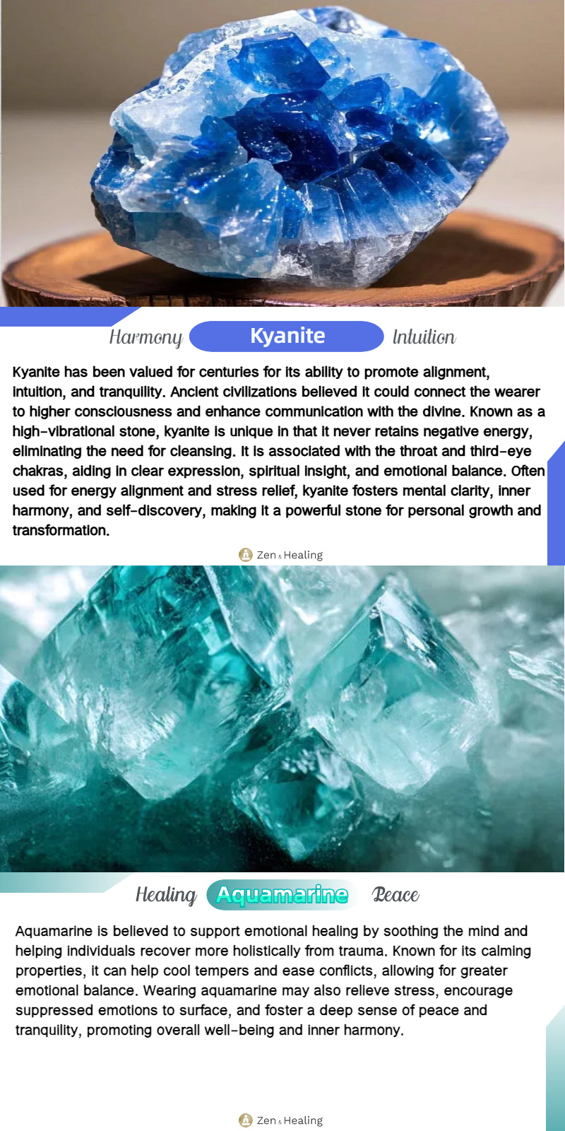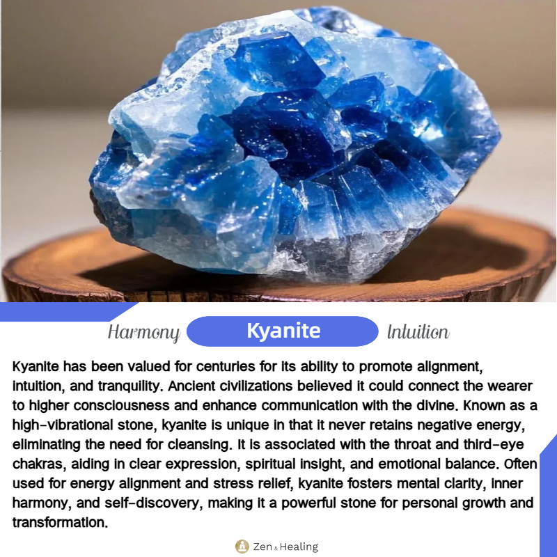 • Kyanite (Stone of Alignment): Known for its ability to align chakras, enhance intuition, and promote inner harmony, kyanite clears blockages and strengthens communication skills.