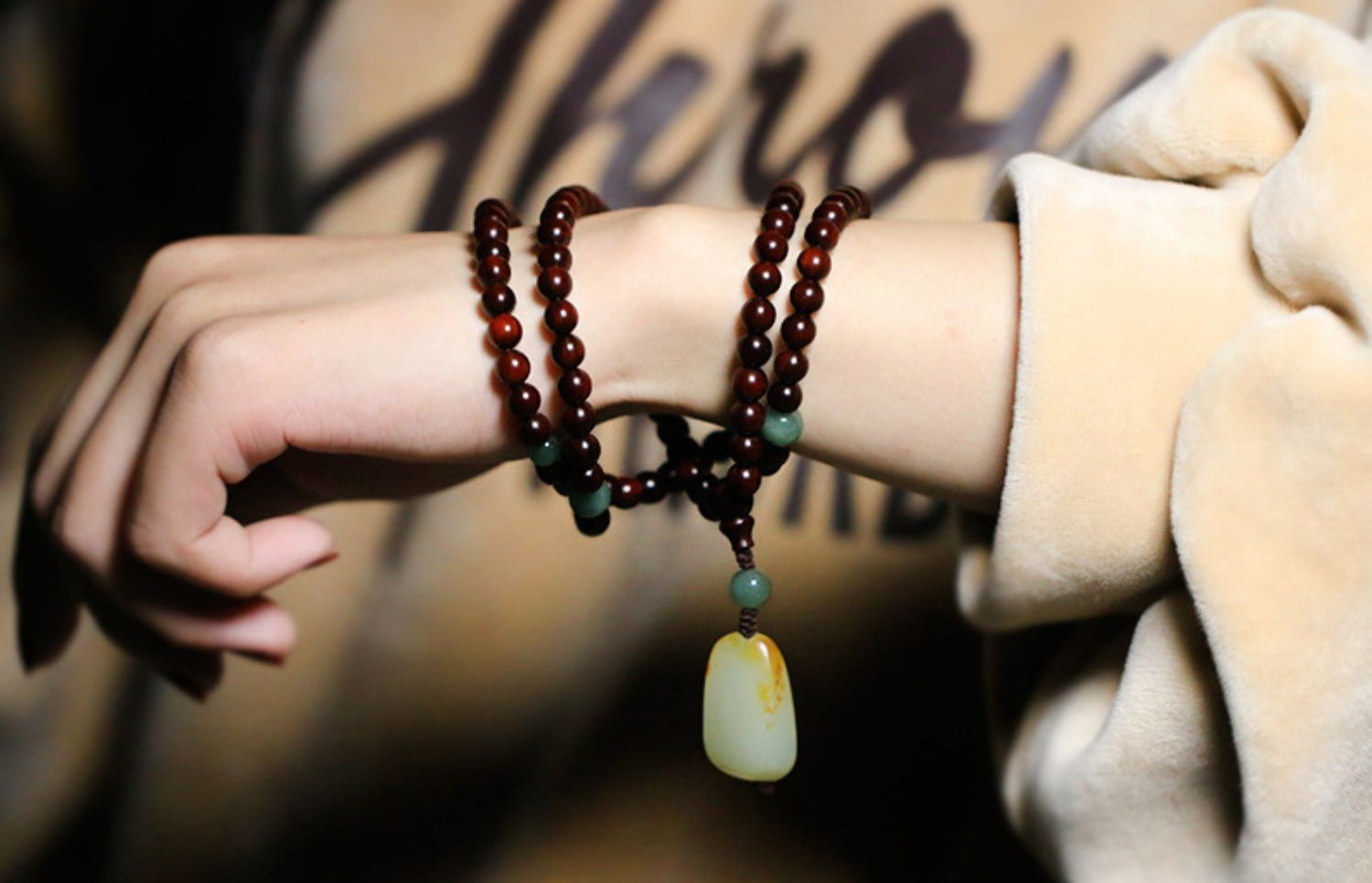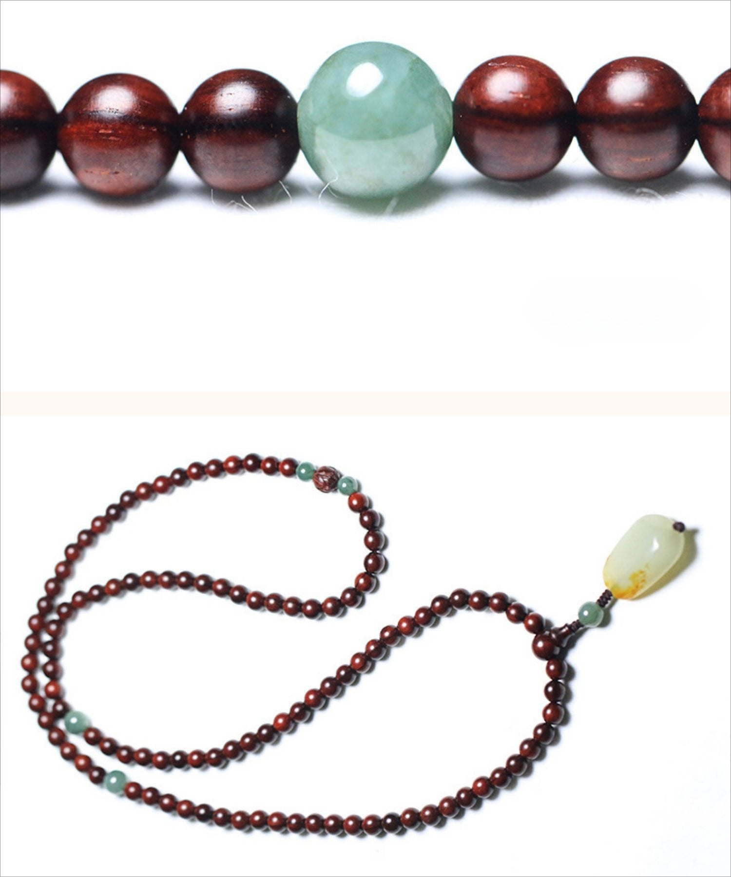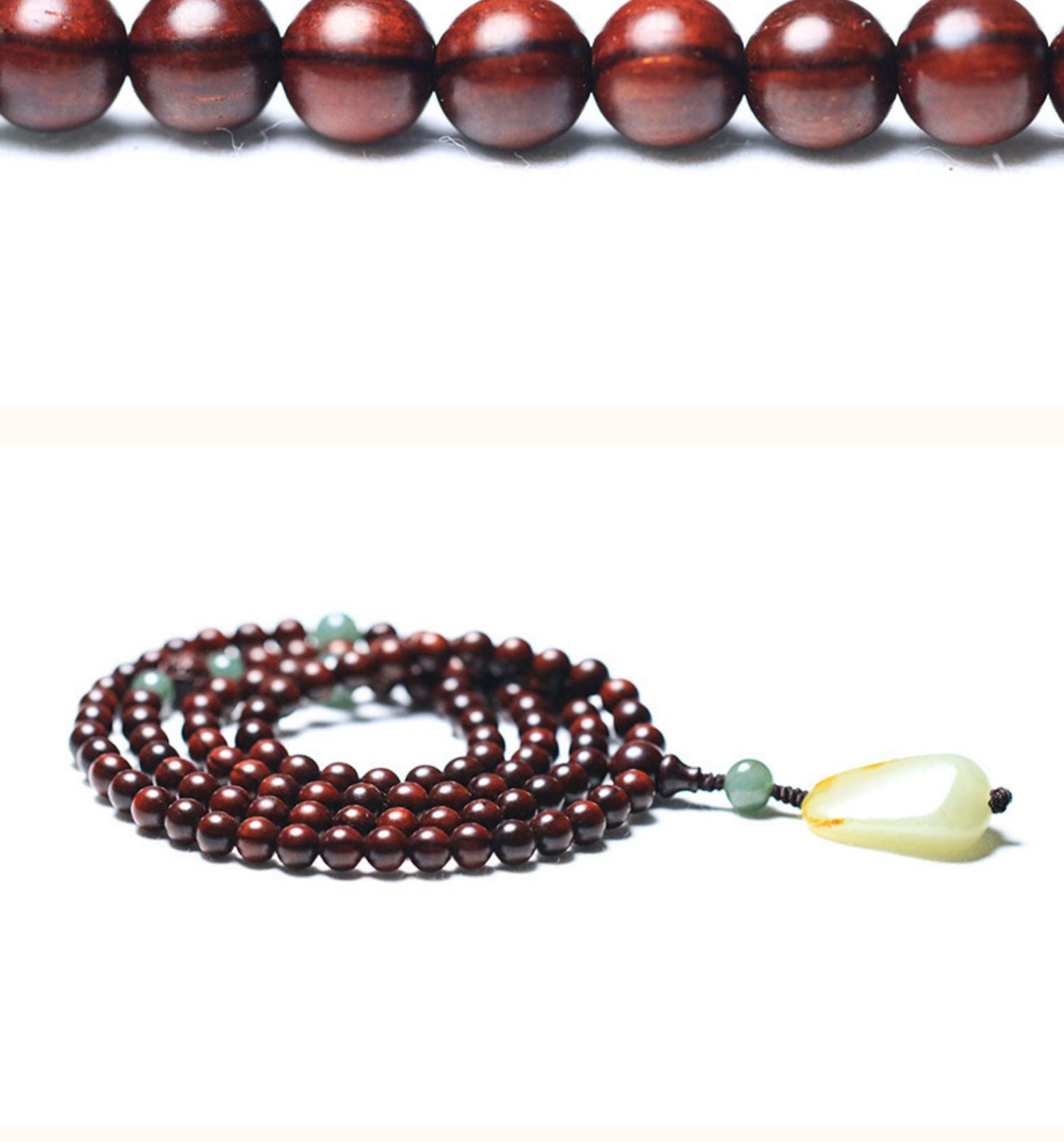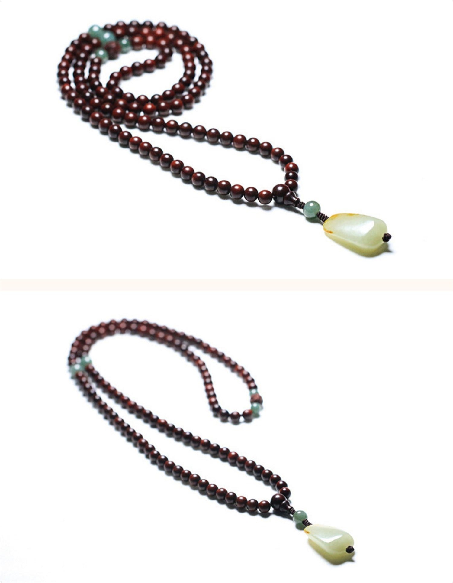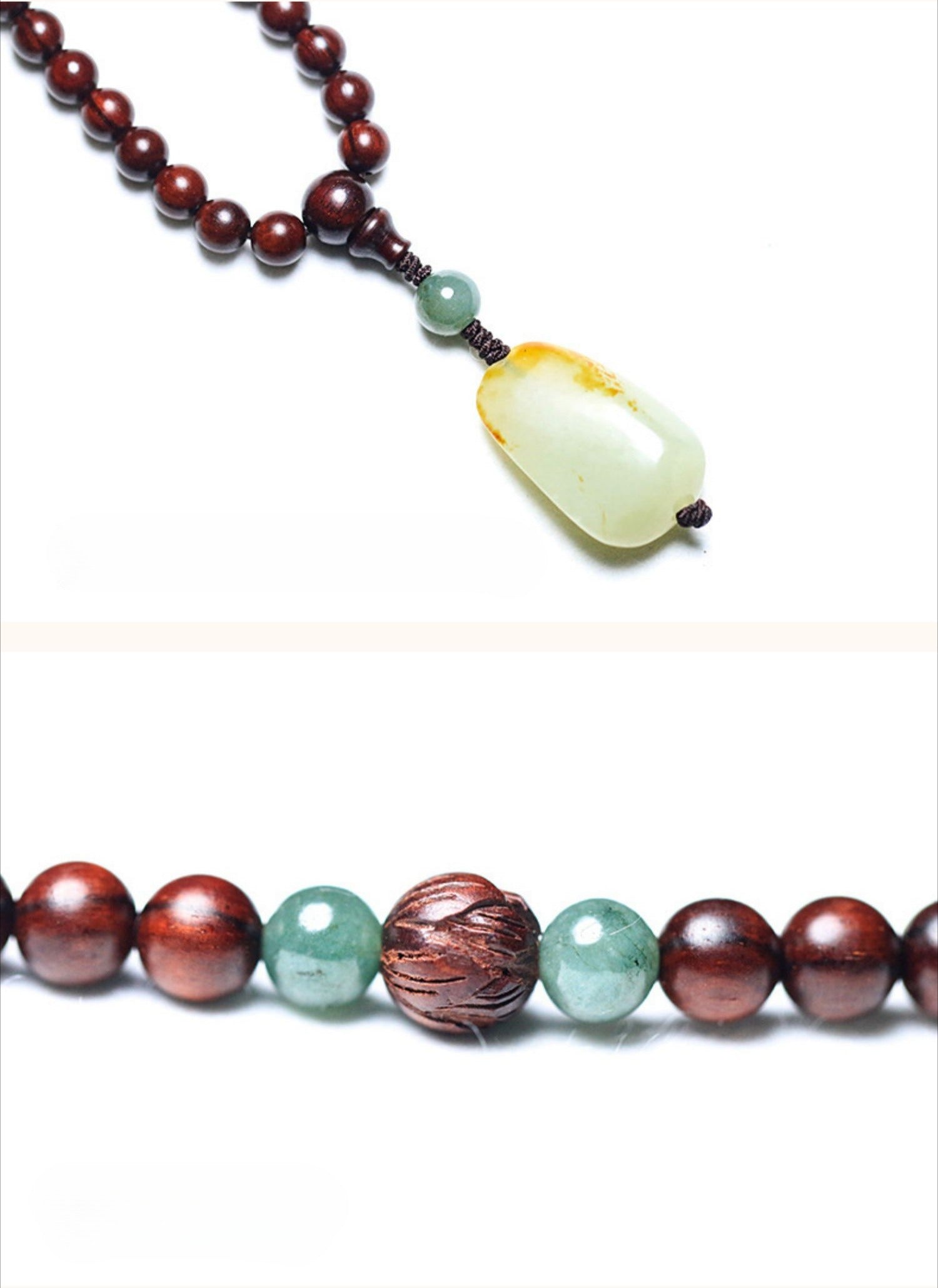 1. Keep the mala in a dry place and avoid exposure to water or chemicals to preserve the natural wood and jade.