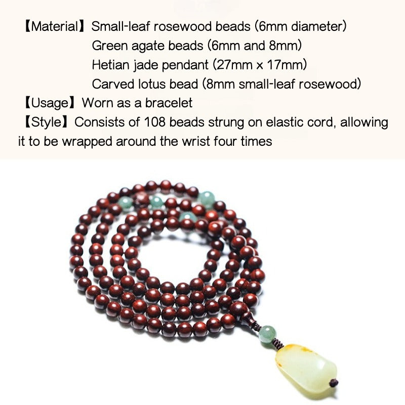 Introducing the Zen Healing Small Leaf Red Sandalwood Jade 108 Mala Beads Meditation Bracelet—a handcrafted piece designed to promote emotional balance and inner peace. This bracelet features 108 small leaf red sandalwood beads, known for their calming properties, and a Hetian jade pendant symbolizing purity and protection.