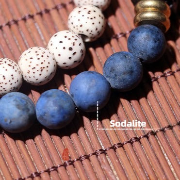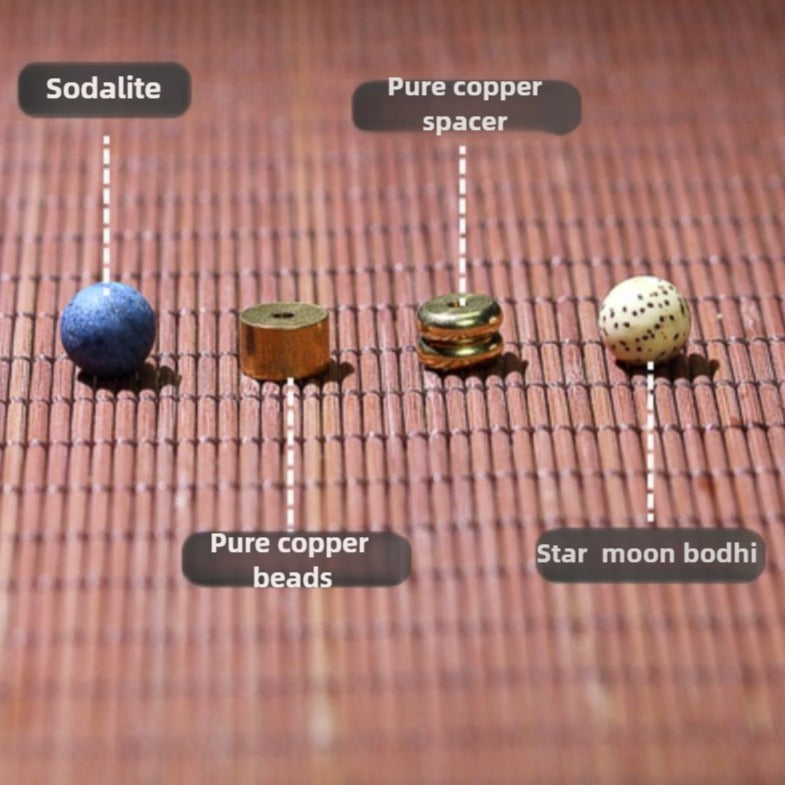 Wear the bracelet on your wrist to benefit from its healing properties throughout the day. The Star and Moon Bodhi, Sodalite, and Lava Rock help promote balance, clarity, and grounding.