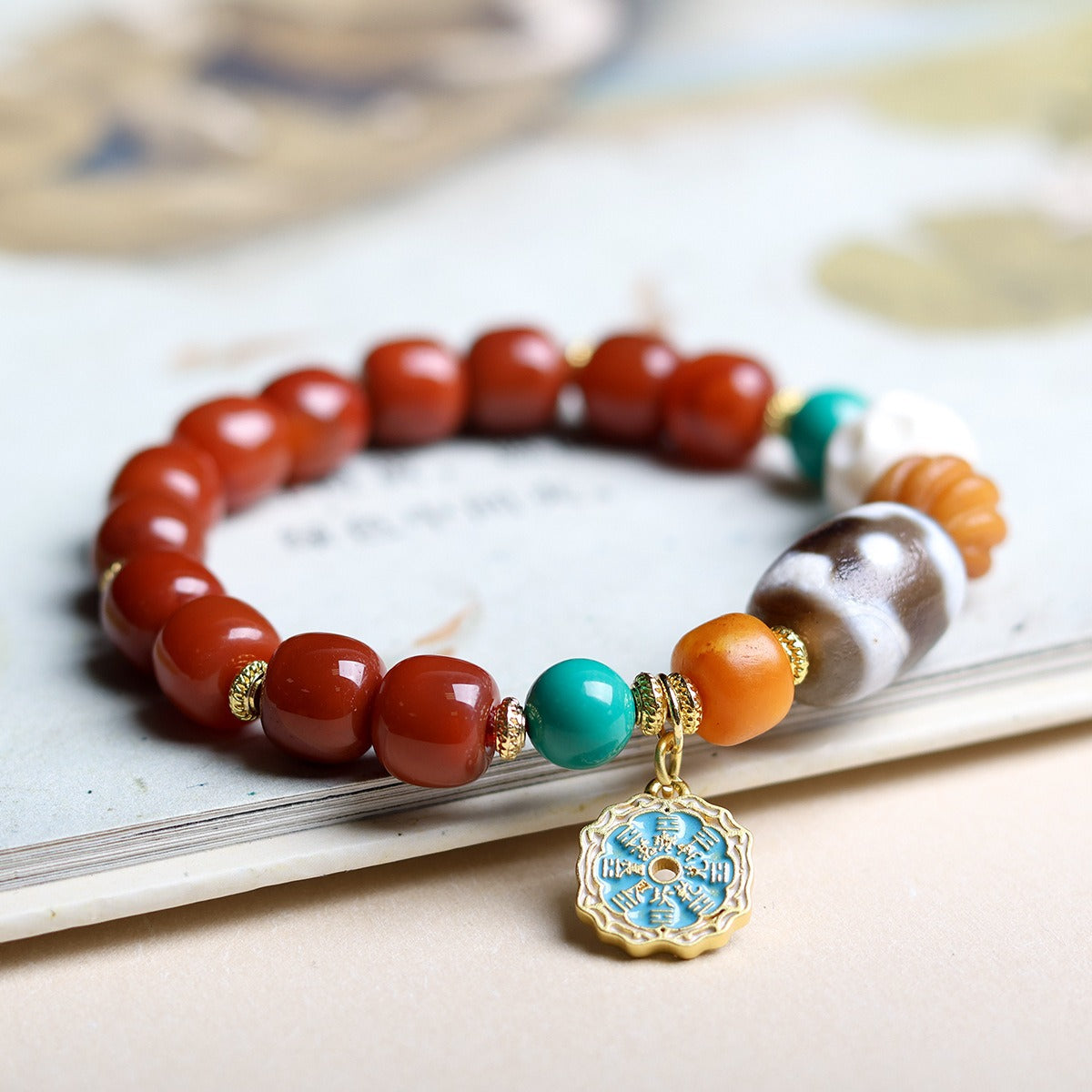 Zen Healing Tibetan Southern Red Agate Three-Eye Dzi Bead Yak Bone Prosperity Bracelet