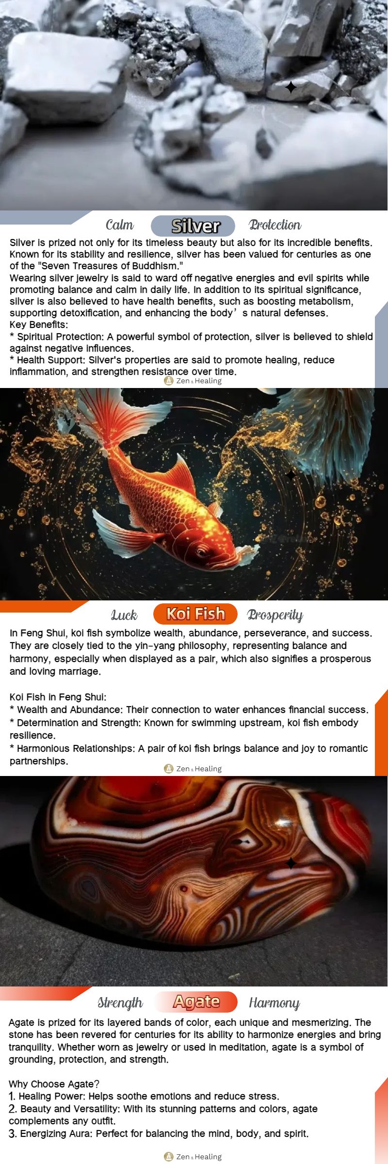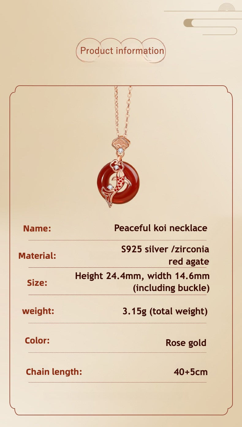 Design: Features an intricately designed koi fish pendant that symbolizes good fortune, peace, and spiritual strength.