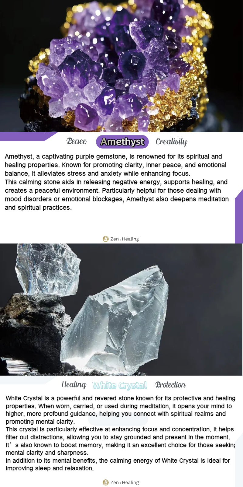 • Amethyst Crystal: Known for its ability to calm the mind, relieve stress, and promote emotional healing, amethyst is believed to help clear negative energy and bring spiritual growth.