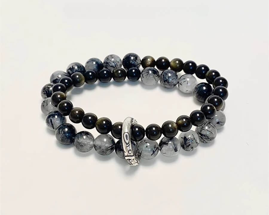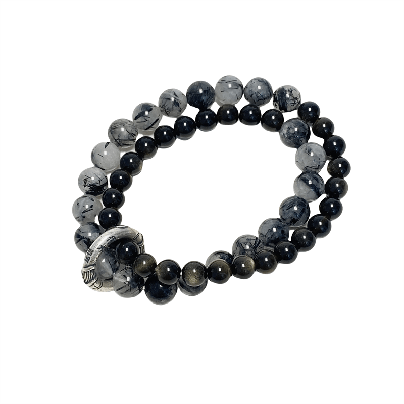 990 Sterling Silver Black Rutilated Quartz Golden Obsidian Koi Peace & Good Luck Double Layer Bracelet