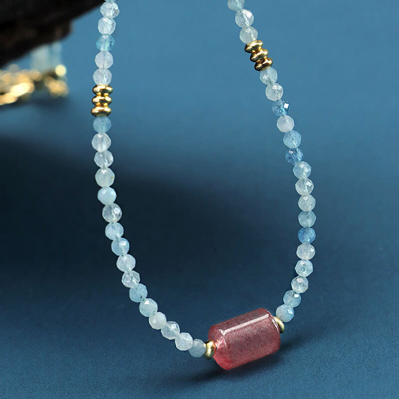 The ocean's waves, tides, coral reefs, surf and beaches are all natural elements that inspired the design of this aquamarine necklace. With its tranquil blue light, aquamarine brings peace and harmony to our hearts. Each aquamarine is like a teardrop of the ocean, carrying the depth and mystery of the ocean. Paired with a strawberry quartz, you can attract a beautiful love on the basis of inner peace and abundance.