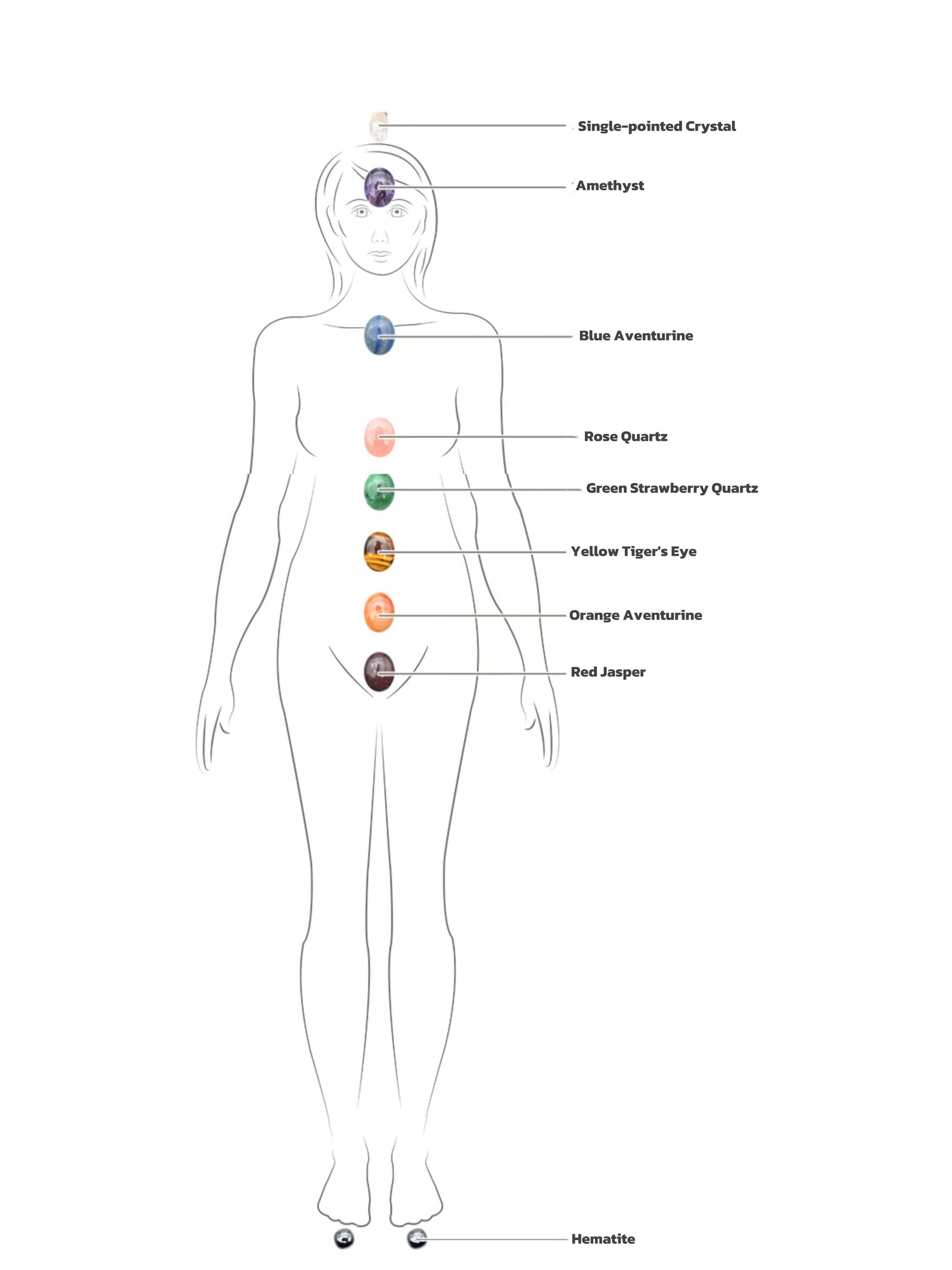 (The tip of the Single-pointed Crystal at the Crown Chakra should point downwards to help align the chakras; the Hematite at the Base Chakra can be placed inside socks, close to the Yongquan acupoint.)