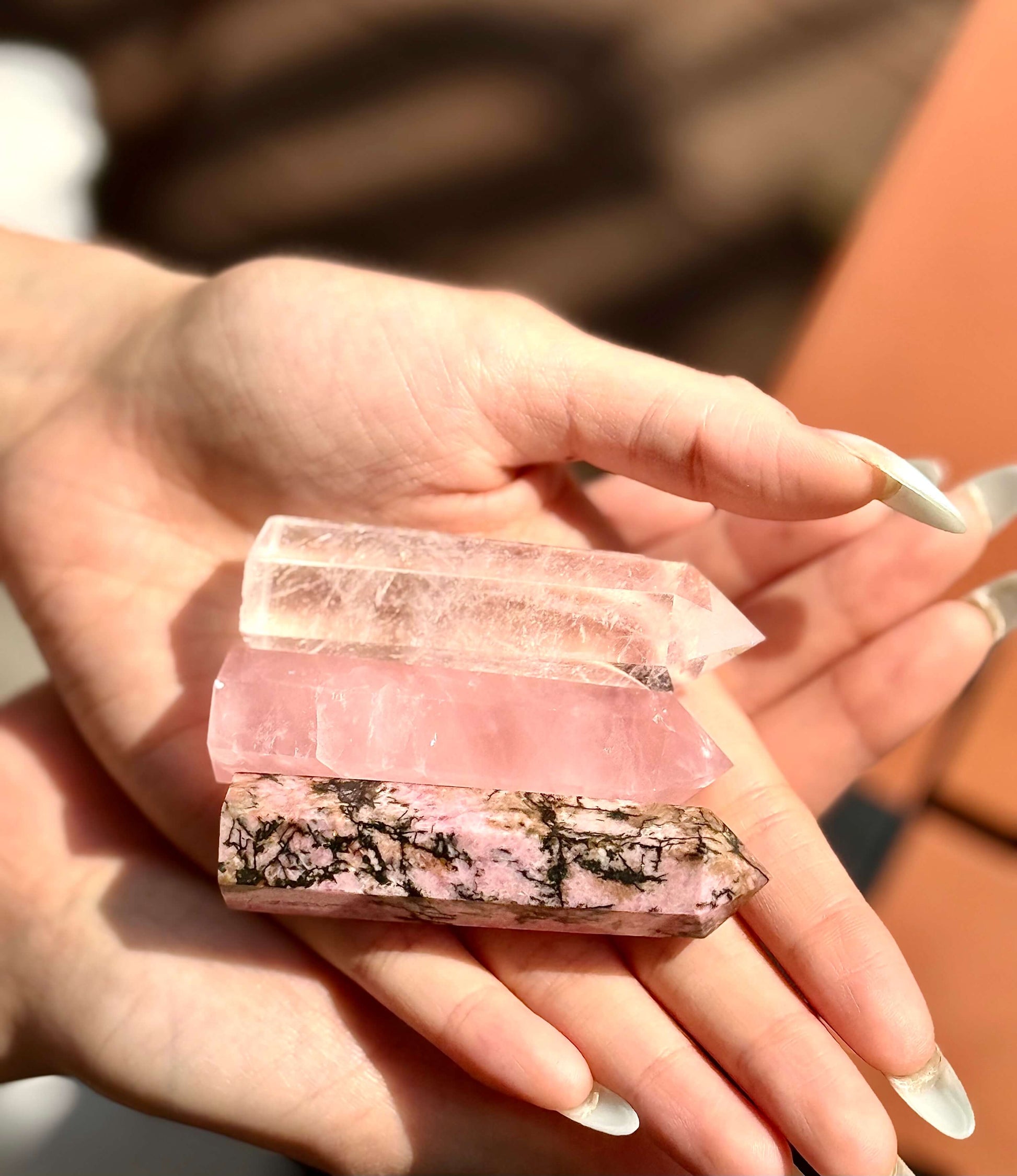Using crystal points for meditation to enhance emotional energy is a practice that combines the natural energies of crystals with the calming effects of meditation. Here's how you can use Rhodonite, Clear Quartz, and Rose Quartz points to elevate your emotional energy during meditation: