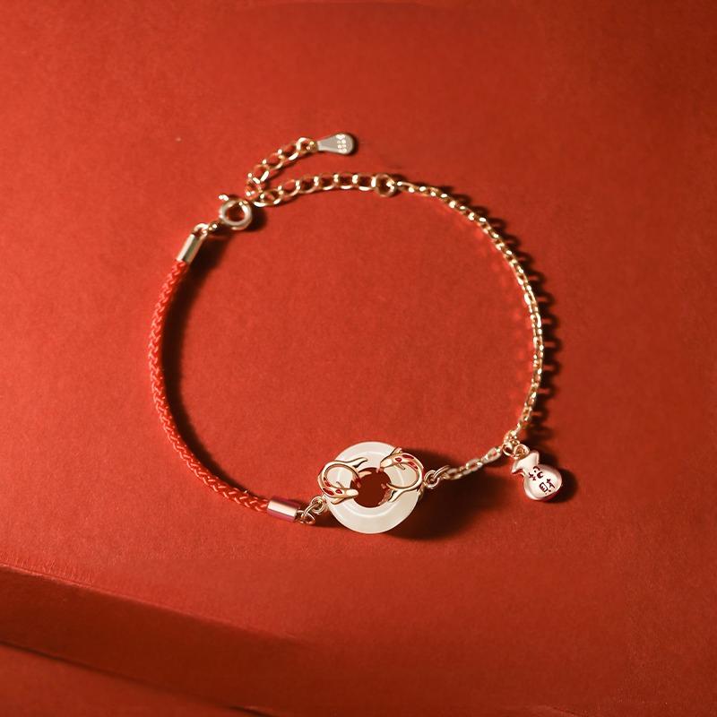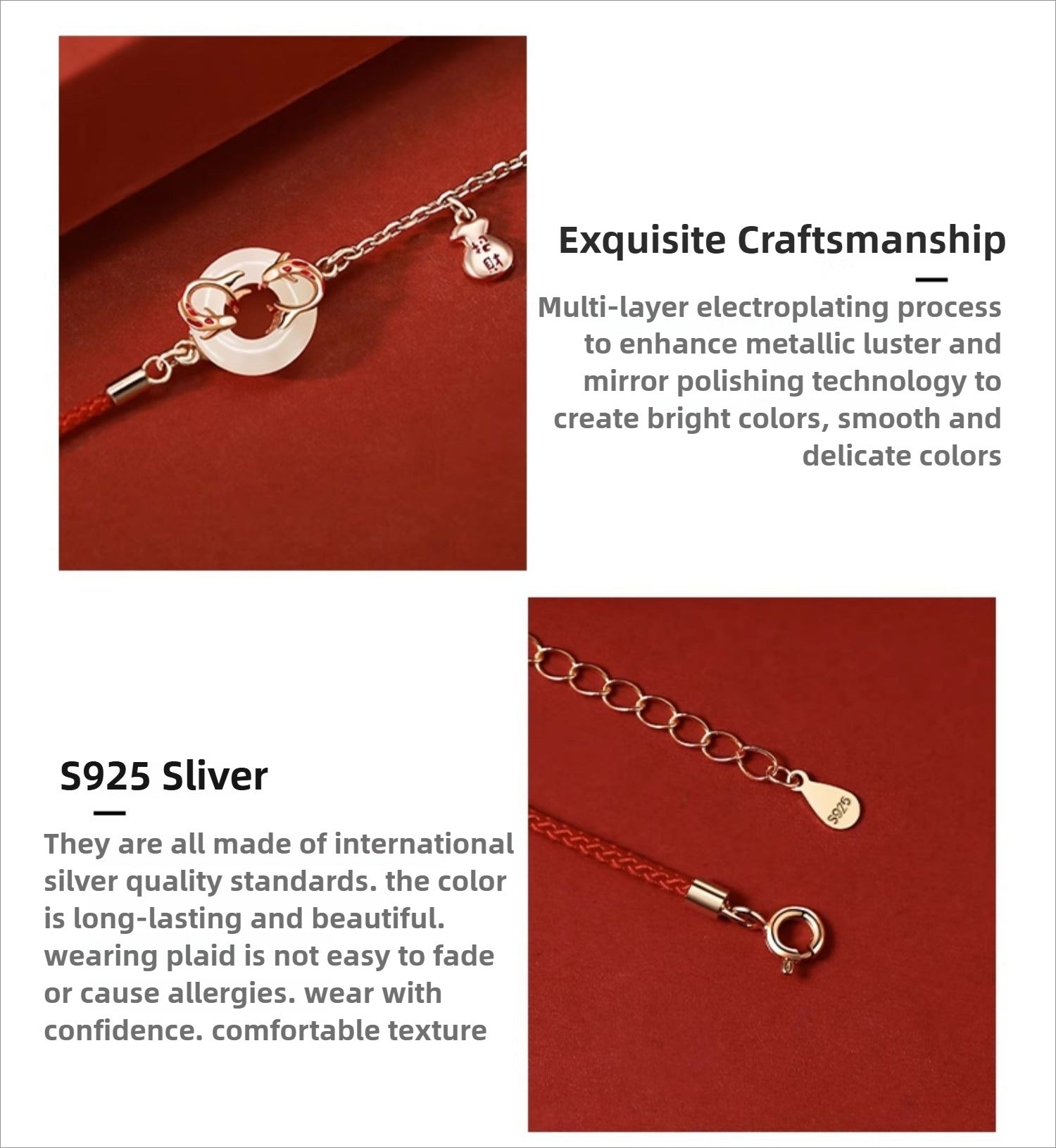 Fengshui 925 Sterling Silver Koi Fish Hetian Jade Peace Buckle Positive Red String Bracelet