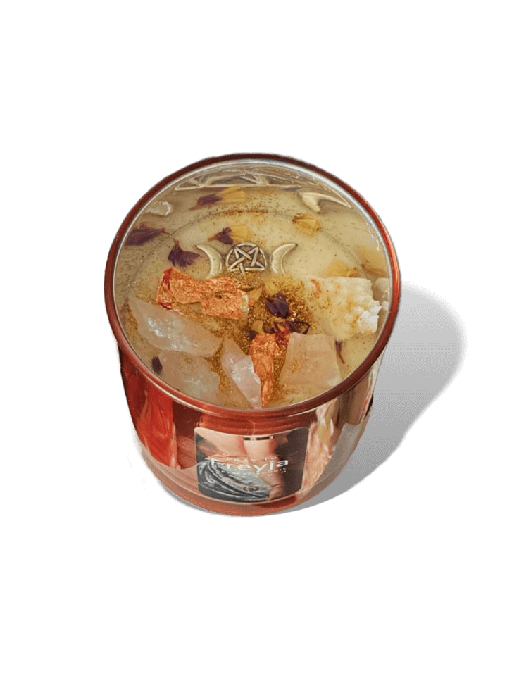 Goddess Freyja, known in Norse mythology as the deity of beauty, fertility, war, and gold, inspires this exquisite crystal essential oil fragrance candle. Light this candle to help manifest feminine charm and beauty, foster the love you desire, and symbolize strength, independence, and feminine power.