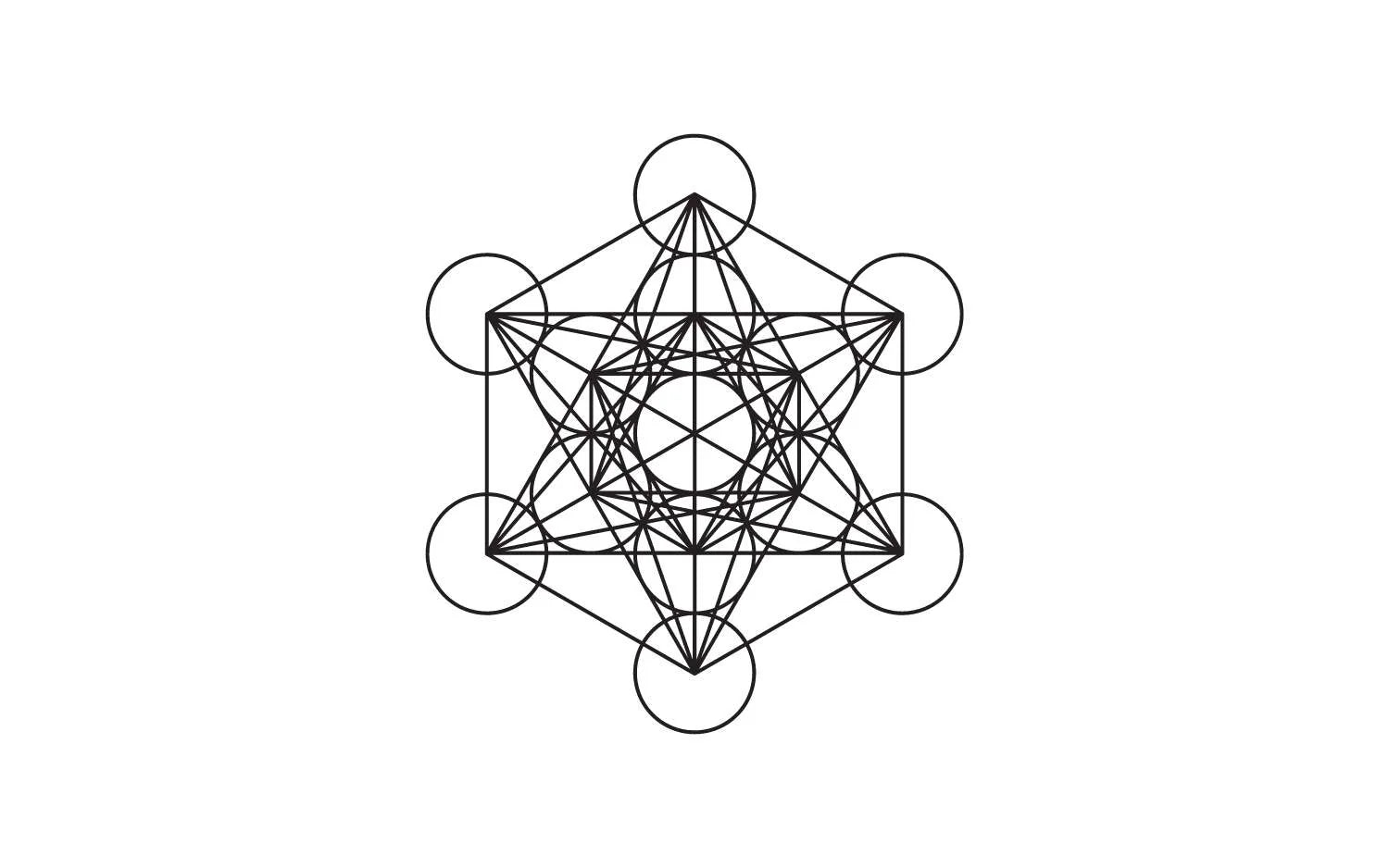 Metatron’s Cube is a complex geometric figure that starts with a simple shape: the Flower of Life. By connecting the centers of each of the circles in the Flower of Life, a series of interlocking patterns emerge, forming a cube-like structure. The result is a multi-dimensional geometric figure composed of 13 circles, with straight lines connecting each one.