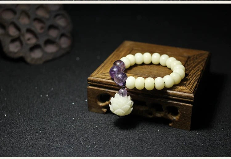 This exquisite piece combines the purity of white jade and bodhi root beads with the spiritual resonance of amethyst, all centered around a delicately crafted lotus charm. The bracelet is a harmonious blend of natural materials, designed to embody tranquility, balance, and mindfulness. Perfect for meditation, daily wear, or as a meaningful gift, it brings a touch of Zen-inspired beauty to your life.