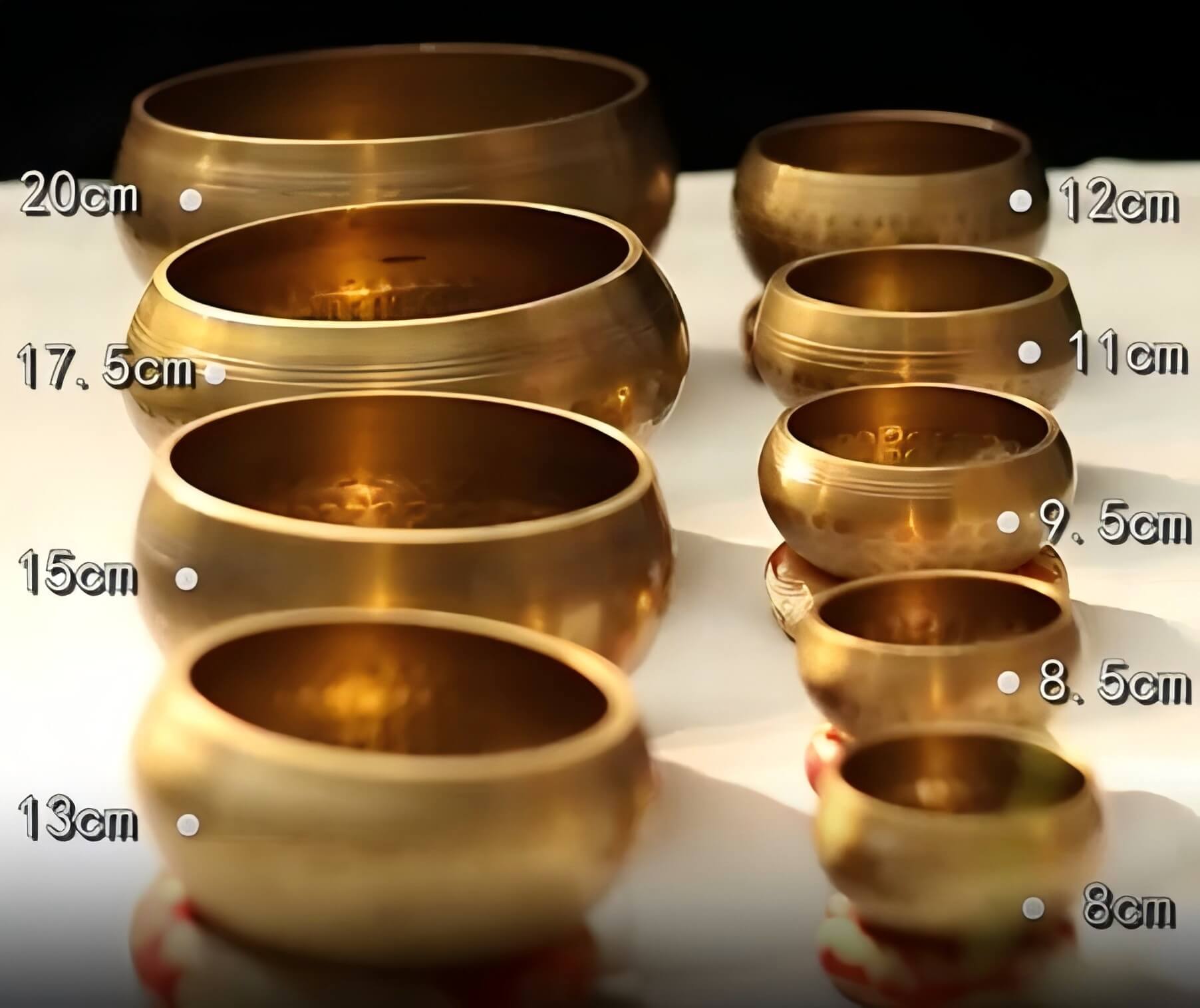 Singing bowls of different sizes have different diameters, ranging from 4cm to 20cm.