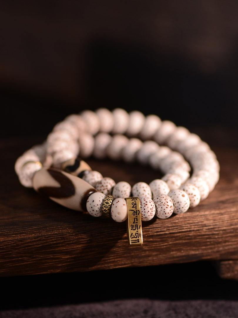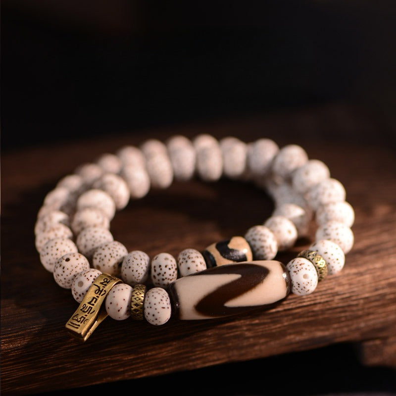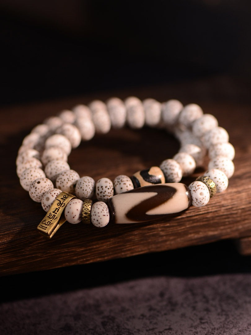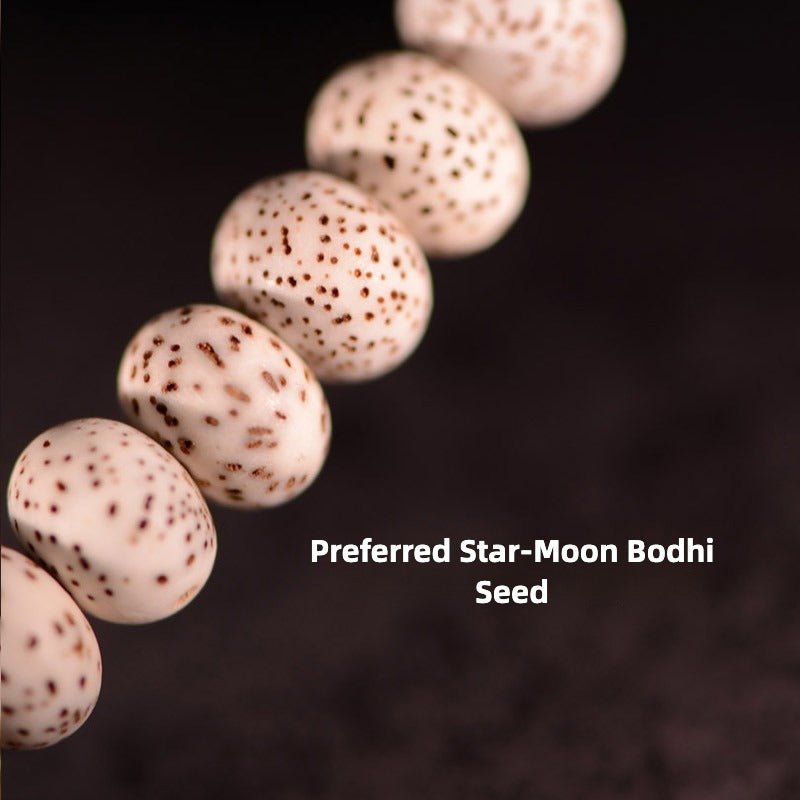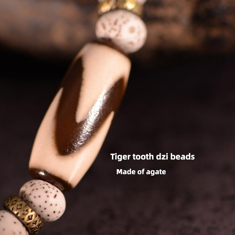 This bracelet features Star Moon Bodhi beads with their unique starry and moon-like patterns, symbolizing mindfulness and cosmic balance. The addition of the Tiger Tooth Dzi Bead, renowned for its protective and empowering qualities, brings strength and courage to its wearer. Complemented by rich agate accents, this bracelet offers an elegant way to shield against negativity and invite blessings.