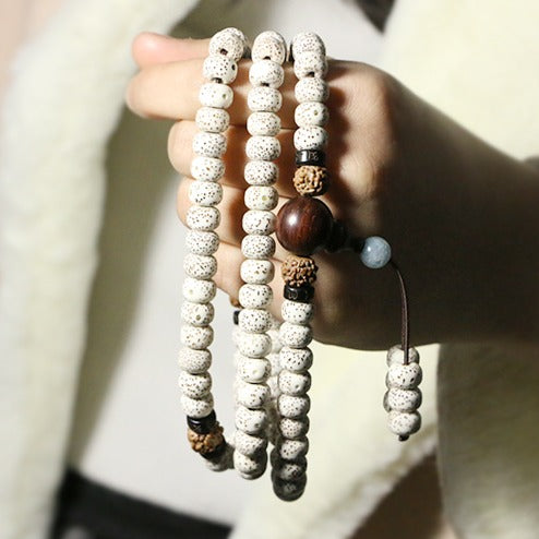 Introducing the 108 Star Moon Bodhi Multi-Wrap Bracelet, a spiritually significant accessory that embodies the essence of awakening and protection. This bracelet is crafted with 108 star moon bodhi beads, known for their deep connection to spiritual growth and enlightenment. The beads are complemented by small leaf red sandalwood and Vajra bodhi beads, which enhance the bracelet's overall protective energy and grounding qualities. With two bead size options (6x8mm and 7x9mm), this bracelet offers versatility and a unique touch for your personal or spiritual practice. Worn as a multi-wrap bracelet, it not only serves as a tool for meditation but also as a meaningful and protective adornment for daily life.