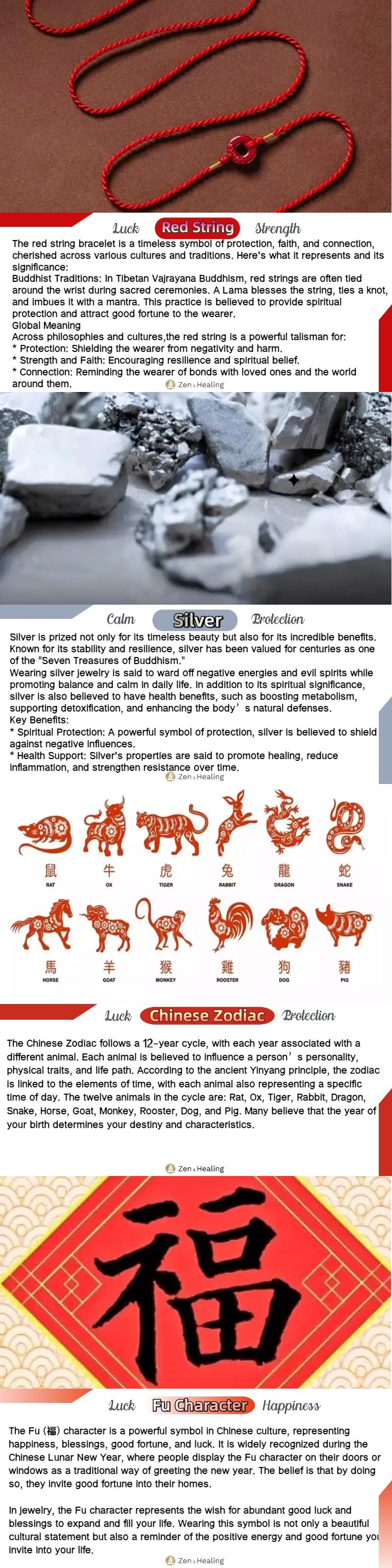The Blessings Red String Set is a symbol of protection, good fortune, and spiritual harmony. Featuring the Chinese Zodiac Agate Protection Red String Bracelet and the S925 Silver Fu Character Peace Bracelet, this set blends traditional Chinese lucky symbols with modern elegance. The red string bracelet is known for warding off negativity and attracting prosperity, success, and positive energy. Paired with the Fu character charm, representing peace, happiness, and blessings, this set is a powerful amulet for those seeking balance, luck, and spiritual well-being.