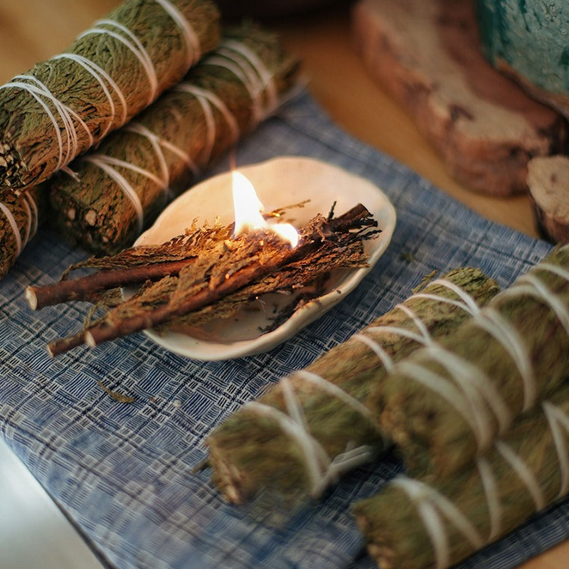 1.Light the Smudge: Ignite Blue Sage, Cedar Stick, or Palo Santo, allowing it to smolder.