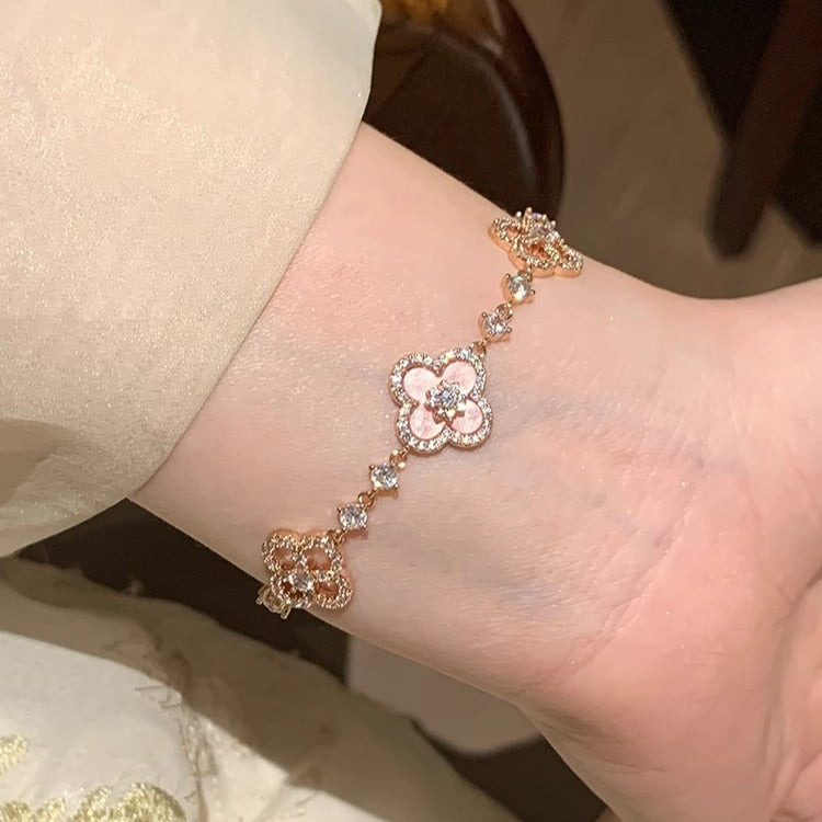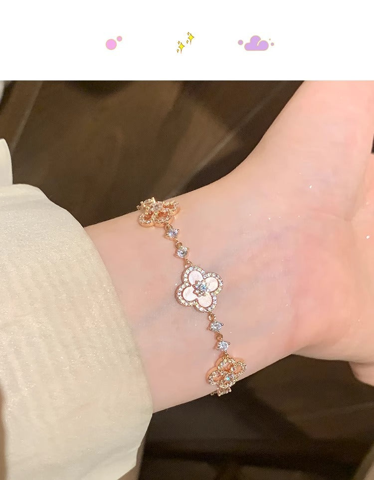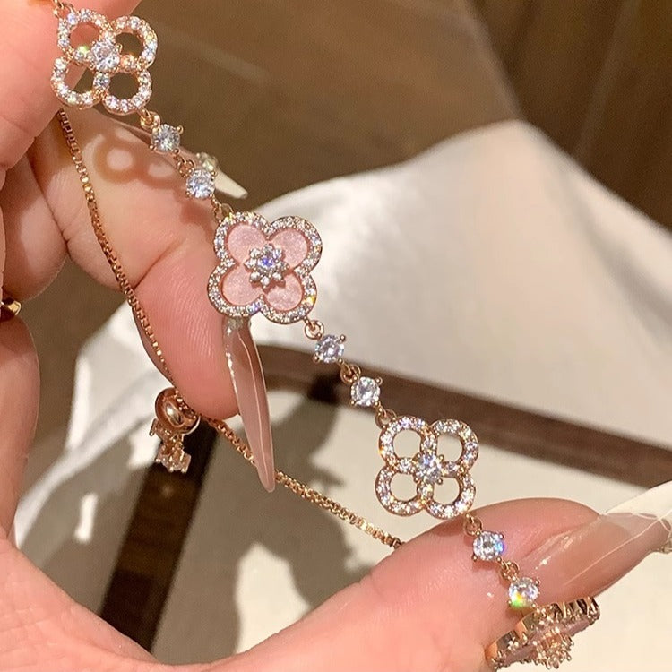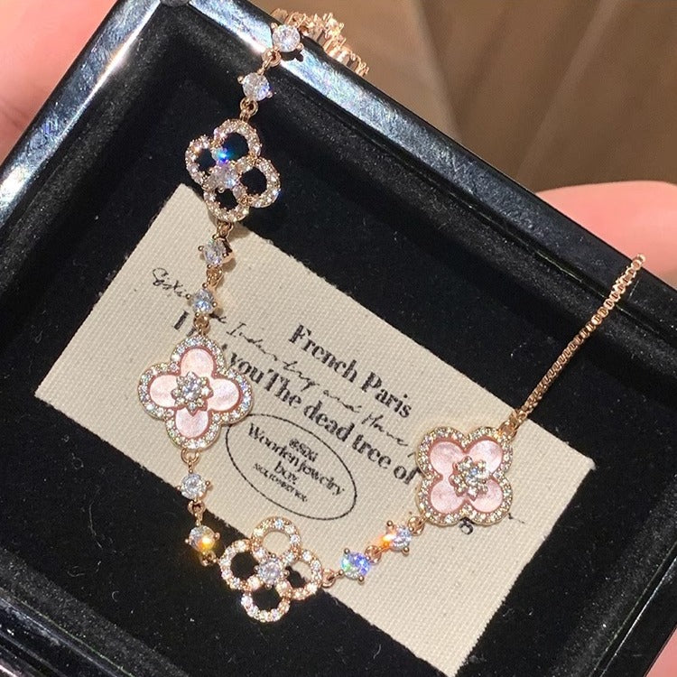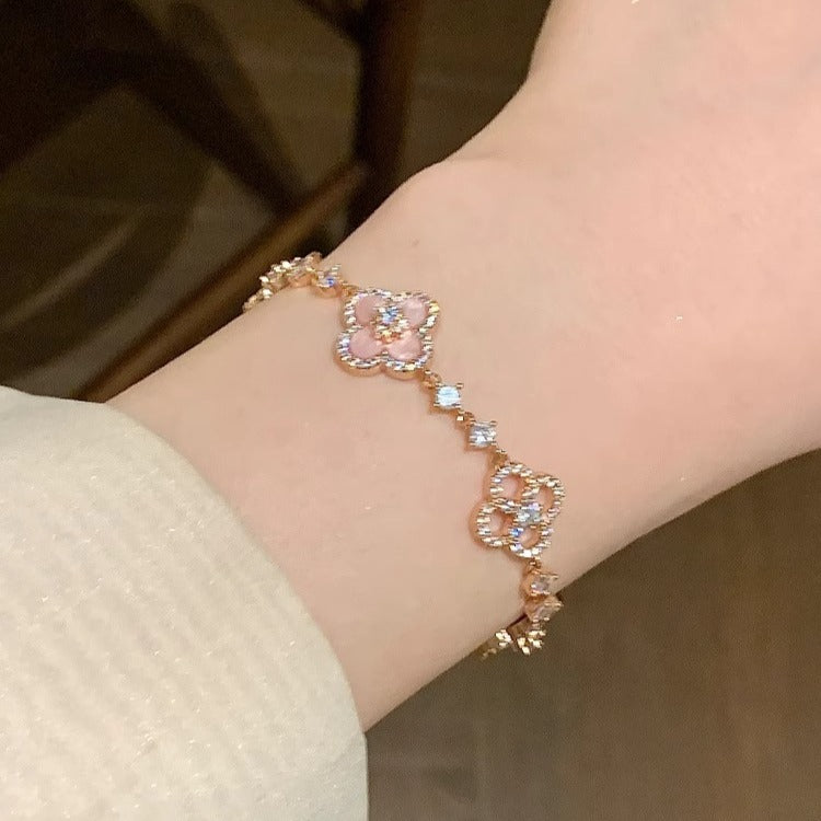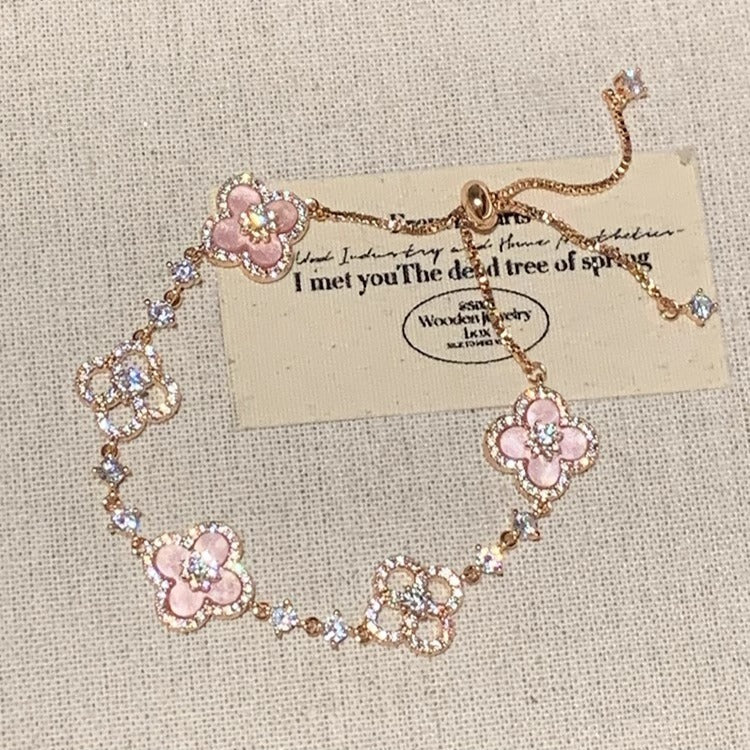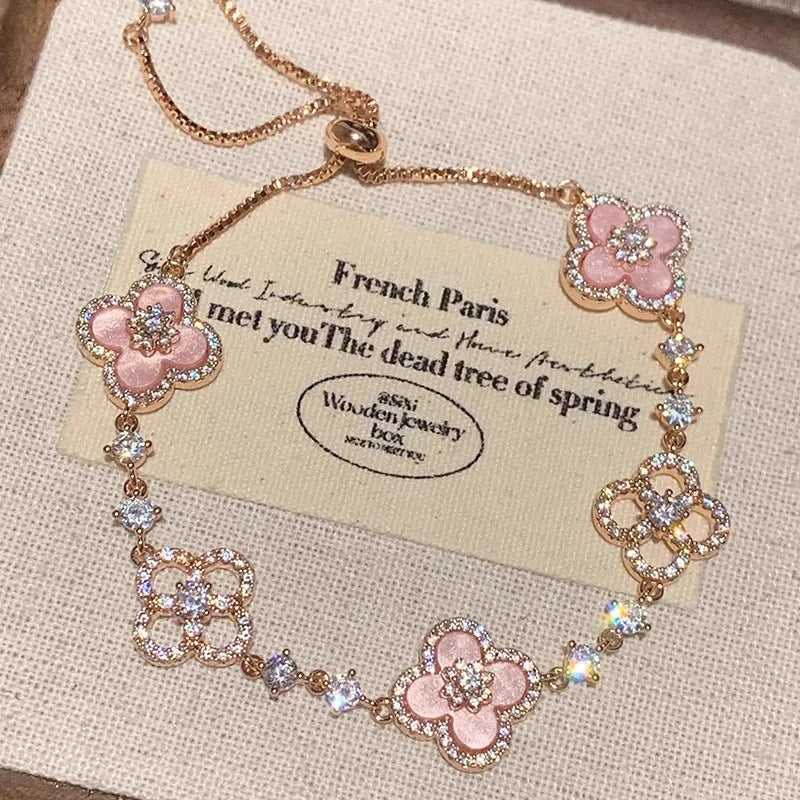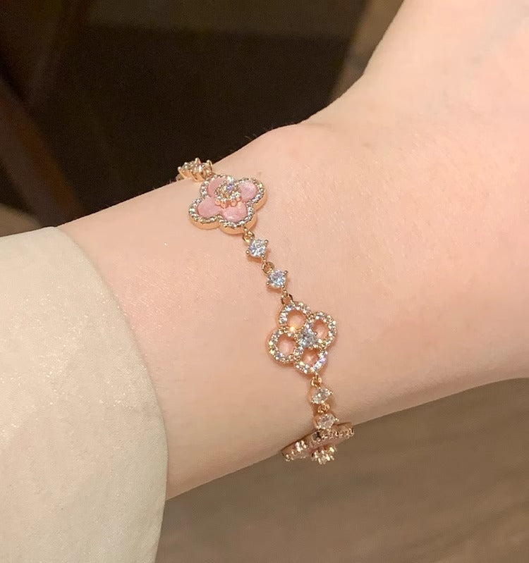 This charming four-leaf clover bracelet brings together elegance, symbolism, and color. Featuring beautifully enameled clovers in your choice of pink, silver, blue, or purple, each flower is outlined with glistening crystals. Crafted in durable copper with a high-quality silver-plated finish, the bracelet resists fading and adds just the right amount of sparkle. The adjustable sliding clasp makes it easy to get the perfect fit, whether worn snug or loose. It's the ideal blend of whimsical charm and everyday practicality.