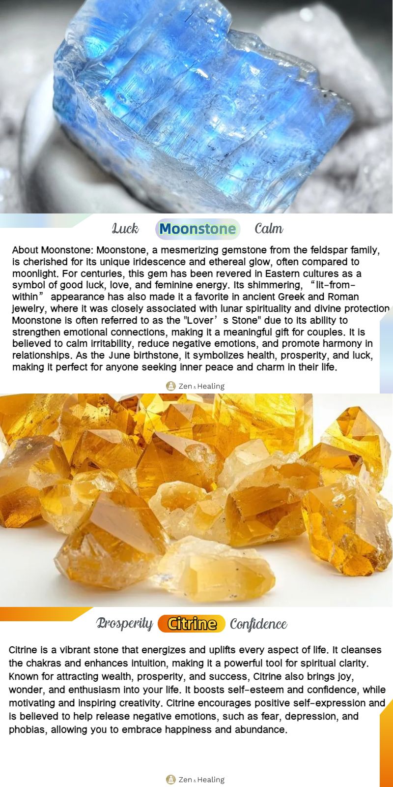 Symbolism: Gray moonstone promotes emotional healing, stress relief, and inner peace. Citrine is known for attracting abundance, positivity, and success.