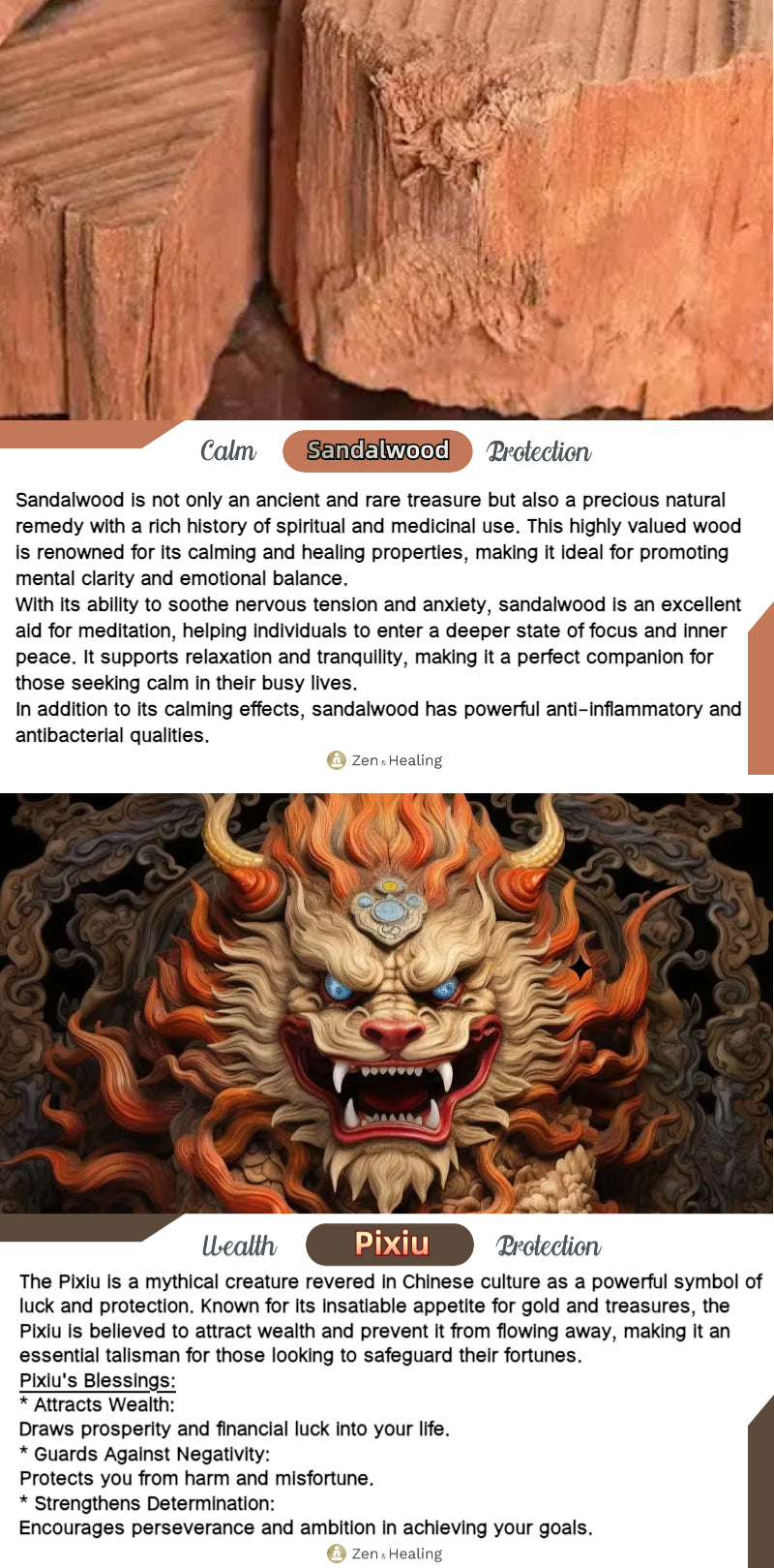• Design Concept: Combines the grounding energy of sandalwood with the protective and prosperity-boosting qualities of PiXiu