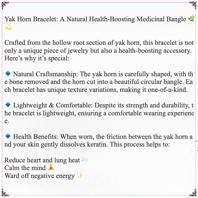 The "Zen Healing" Tibetan Yak Horn Bracelet is a perfect blend of traditional Tibetan wisdom and modern design. This natural bracelet is crafted from genuine Tibetan yak horn, known for its durability and lightweight properties, while offering heat-clearing and evil-warding benefits. Tibetan traditional healing practices believe that yak horn helps balance the body’s energy, clear negative forces, and purify the mind. Not only is it a unique piece of jewelry, but also a symbol of spiritual and physical wellness.